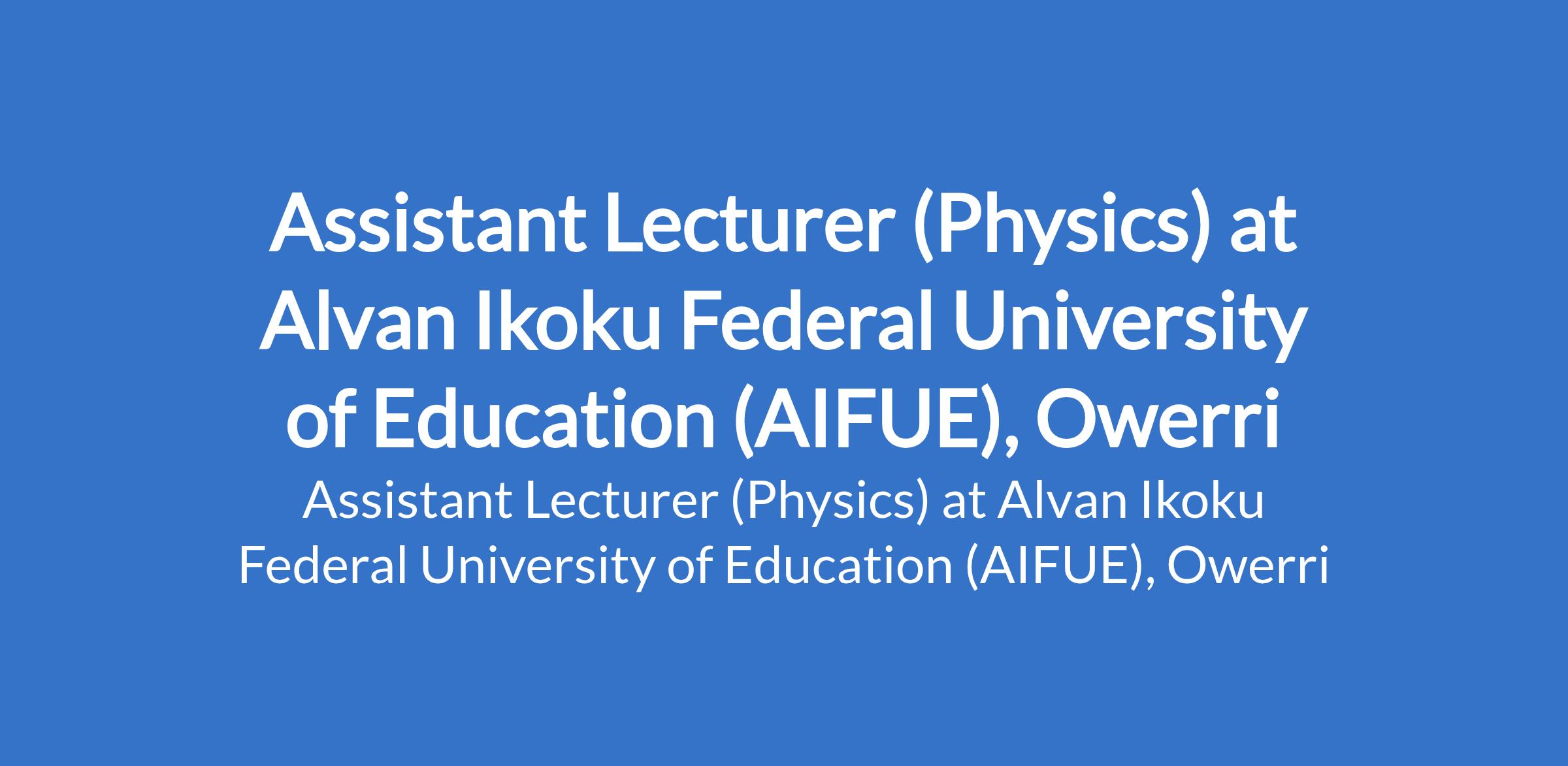 Alvan Ikoku Federal University of Education (AIFUE), Owerri invites applications from suitably qualified candidates for the position of: Assistant Lecturer (Physics). The position is located in Imo State. Interested candidates should possess a Master's Degree in the relevant discipline.