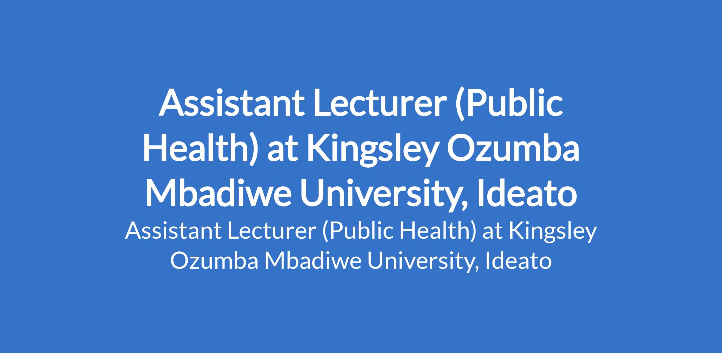 Kingsley Ozumba Mbadiwe University, Ideato invites applications for the position of: Assistant Lecturer (Public Health). The position is located in Imo State. Interested candidates should possess a Master's Degree in the relevant field.