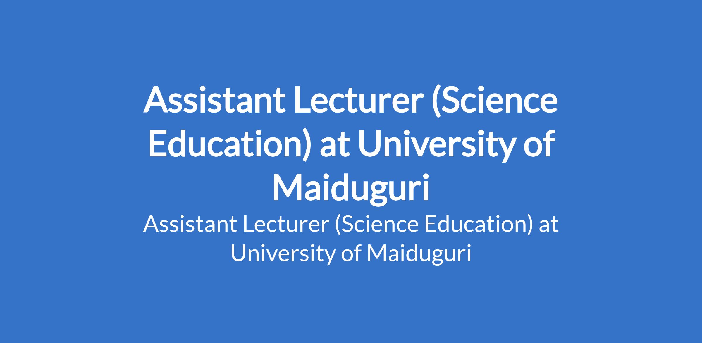 University of Maiduguri invites applications from suitable candidates to fill the position of: Assistant Lecturer (Science Education). The position is located in Borno State. Interested candidates should possess a Master's Degree from University of Maiduguri or another recognised institution or a First Class / Second Class Upper Degree with relevant professional qualification where applicable.