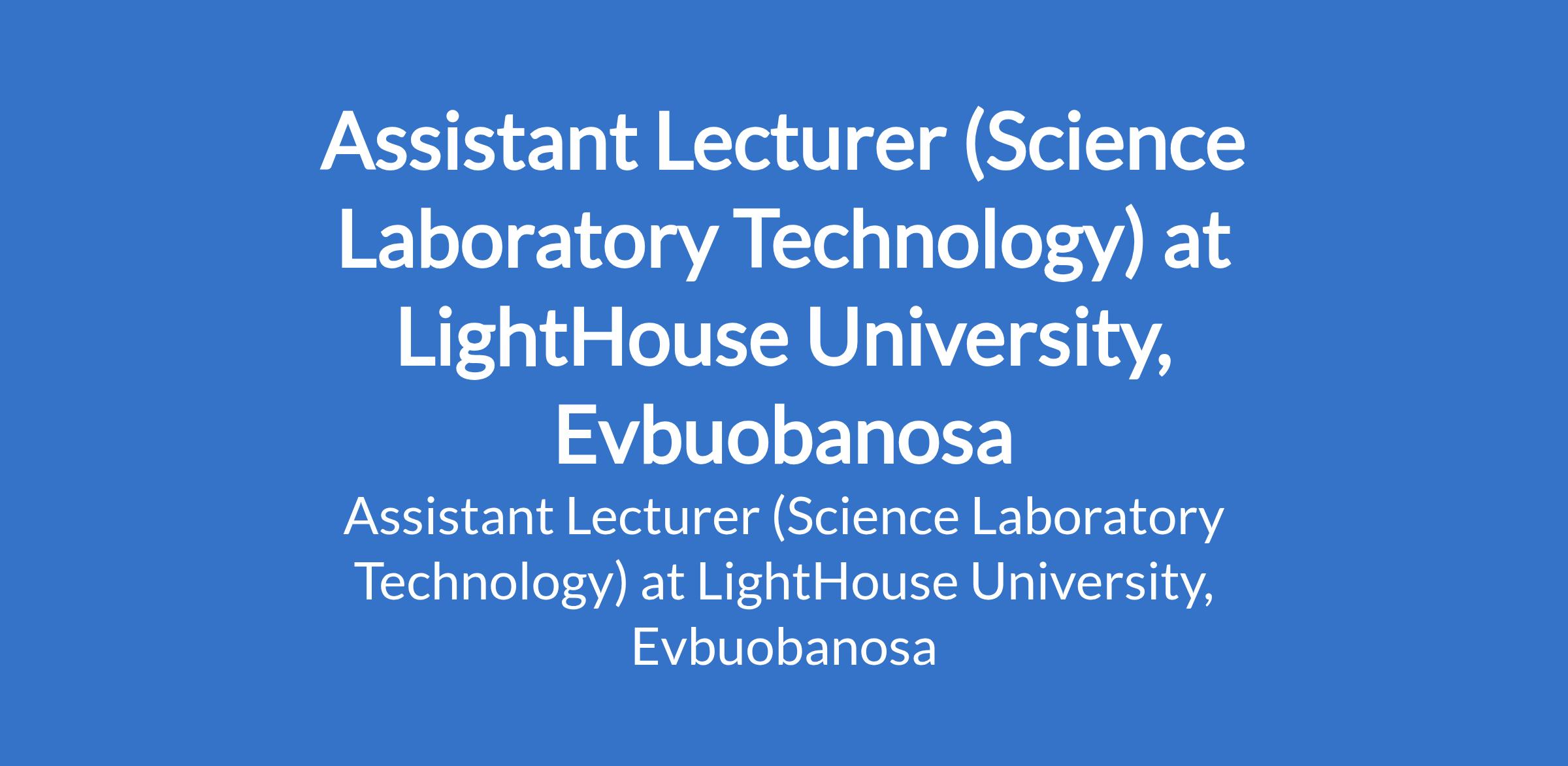 LightHouse University, Evbuobanosa invites applications from suitably qualified candidates to fill the position of: Assistant Lecturer (Science Laboratory Technology). The position is located in Edo State. Interested candidates should possess a Master's Degree in the relevant field; publications are added advantage.
