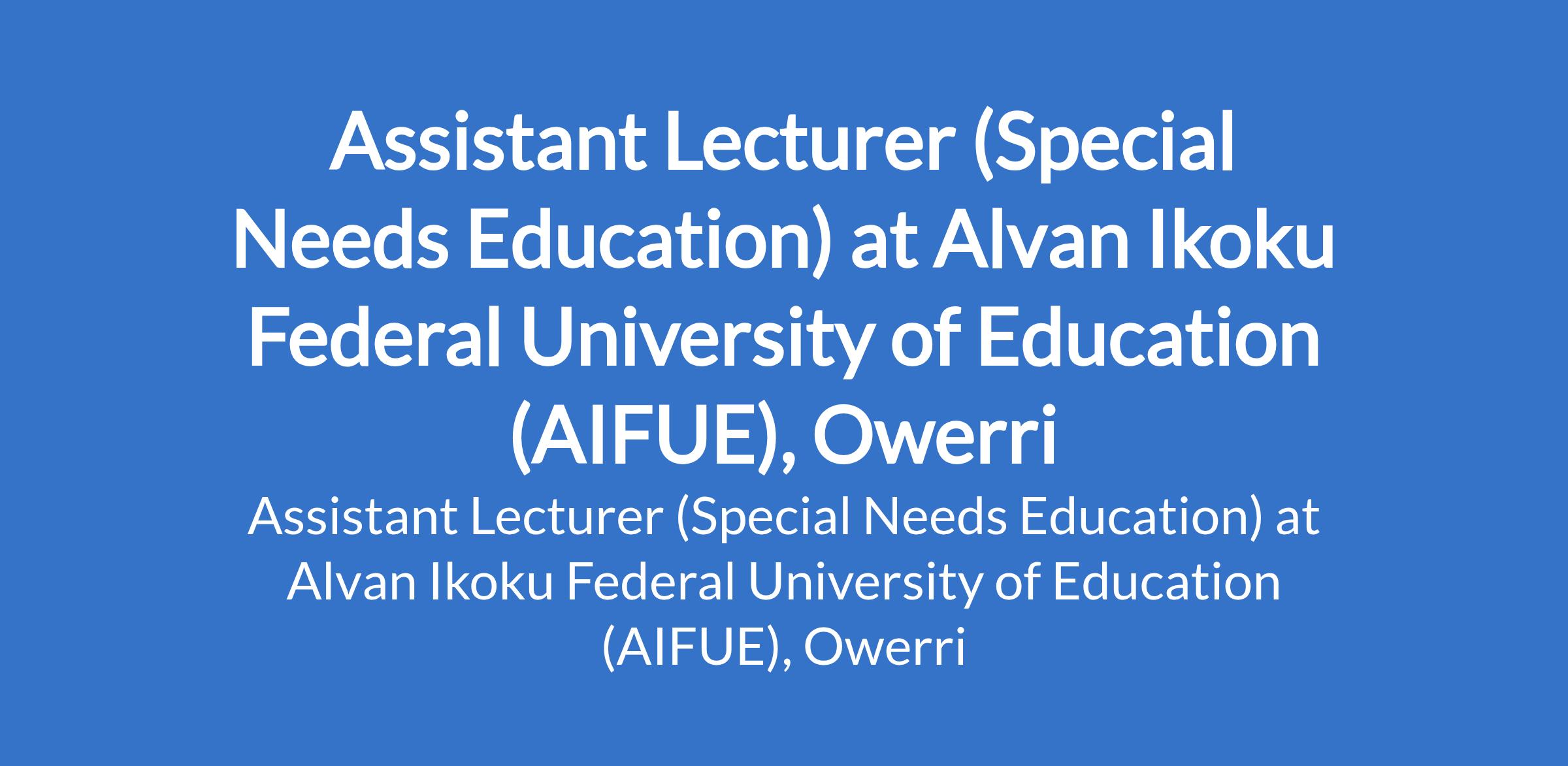 Alvan Ikoku Federal University of Education (AIFUE), Owerri invites applications from suitably qualified candidates for the position of: Assistant Lecturer (Special Needs Education). The position is located in Imo State. Interested candidates should possess a Master's Degree in the relevant field. Evidence of research potential is desirable.