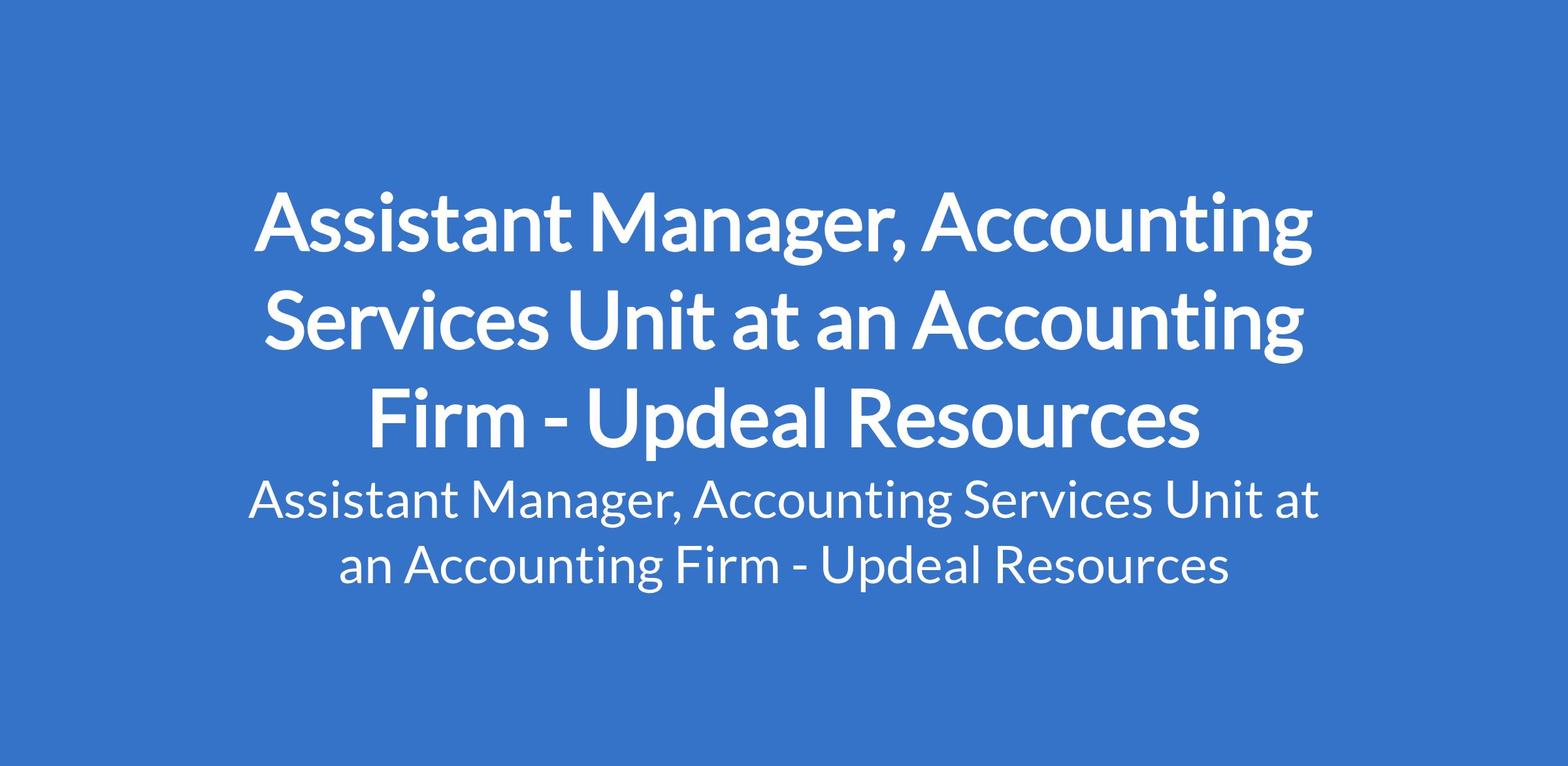 Updeal Resources - Our client, an Accounting Firm is recruiting to fill the position of: Assistant Manager, Accounting Services Unit. The position is located in Lagos State. Interested candidates should possess a Bachelor's Degree in Accounting, Finance, or a related field, with a minimum of 5 years of proven experience in accounting or financial advisory services and must be a Chartered Accountant.