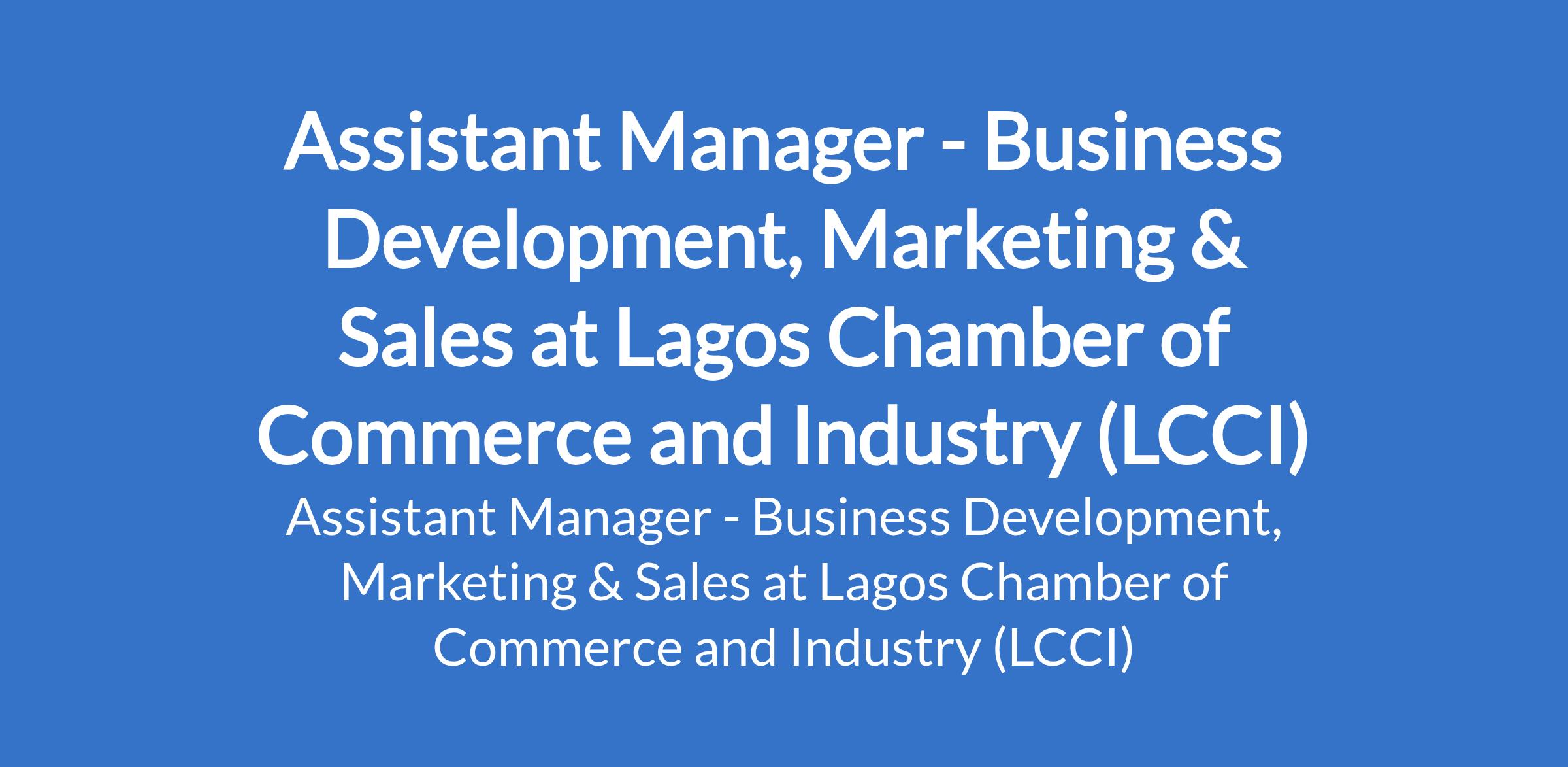 Lagos Chamber of Commerce and Industry is recruiting to fill the position of: Job Opening For An Assistant Manager - Business Development, Marketing & Sales. The position is located in Lagos State. Interested candidates should possess a Bachelors Degree in Marketing, Business Administration, Social Sciences, or a related discipline with 6 - 8 years relevant experience in sales, marketing, and business development.