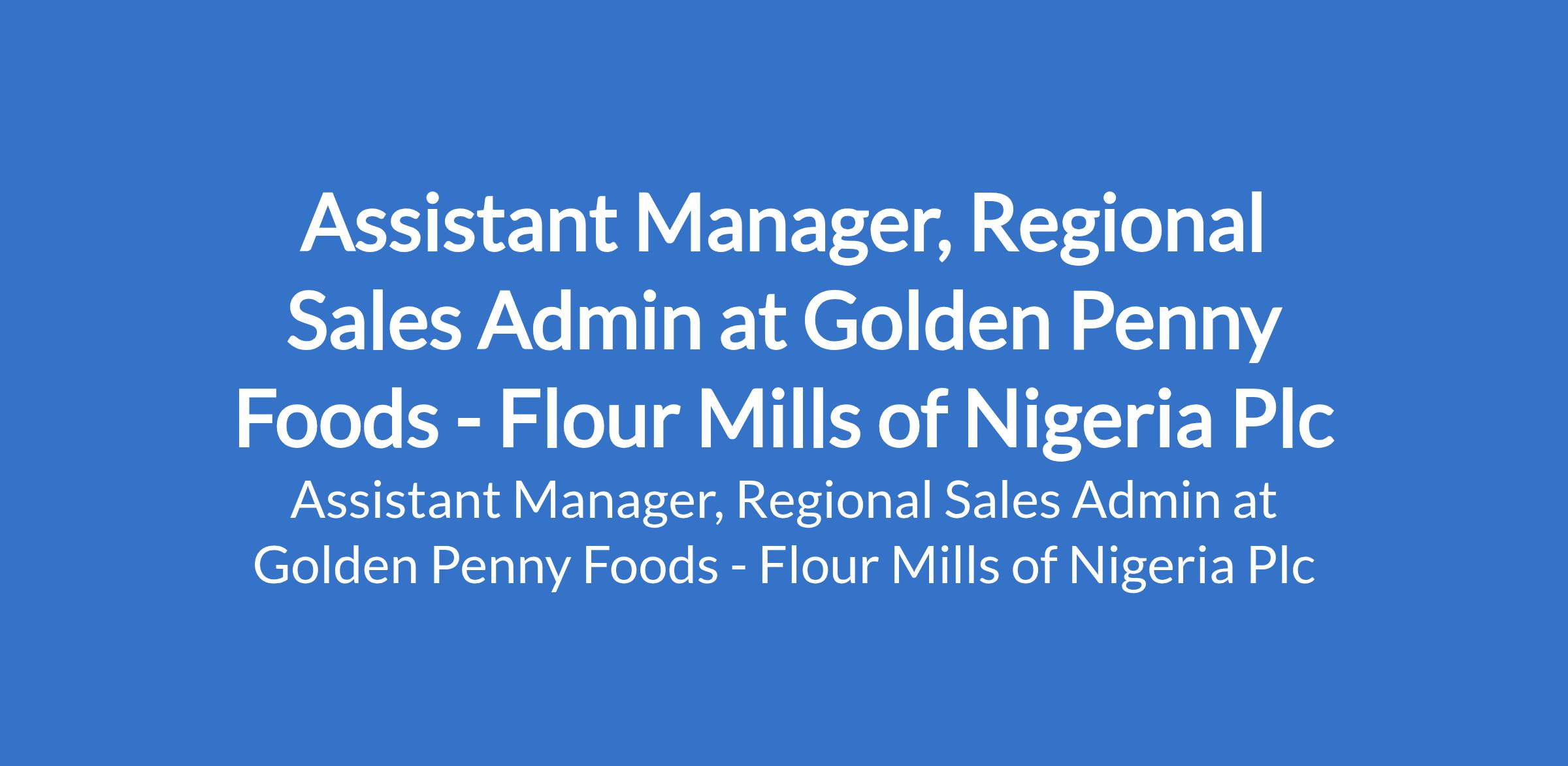 Flour Mills of Nigeria Plc - Our subsidiary, Golden Penny Foods is recruiting to fill the position of: Assistant Manager, Regional Sales Admin. Interested candidates should possess an HND / Bachelor's Degree in Business Administration, Sales, Marketing, or a related field; certification and proficiency in AdvanceExcel, ERP/CRM systems (e.g., Salesforce, Dynamics 365) is high important with 5 8 years of experience in sales administration, operations, or a similar role.