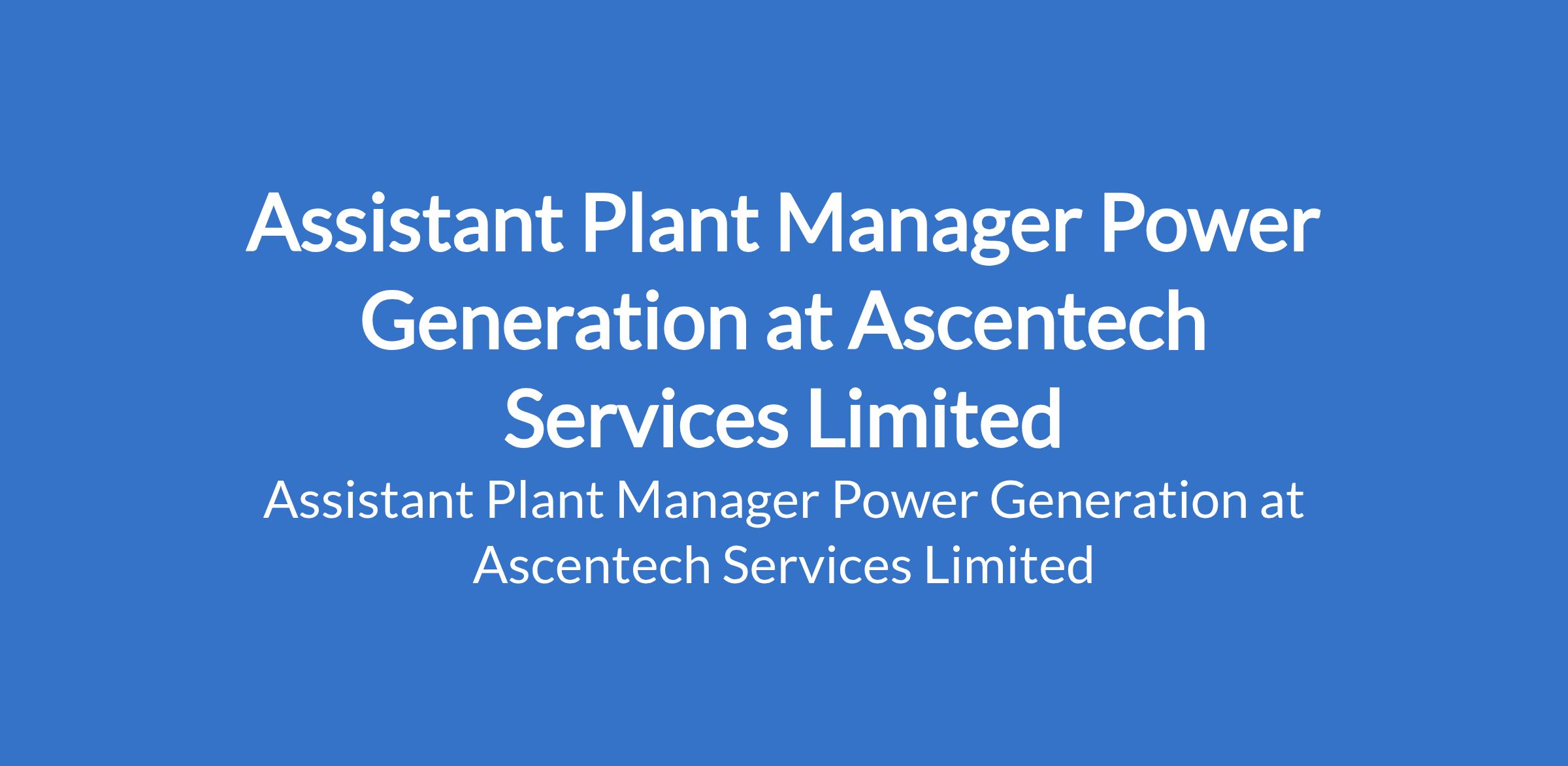 Ascentech Services Limited is recruiting to fill the position of: Assistant Plant Manager Power Generation. The position is located in Lekki, Lagos State. Salary: N700,000 - N1,000,000 monthly. Interested candidates should possess a Bachelors Degree in Electrical, Mechanical, or Power Engineering with 810 years of experience in power generation operations.