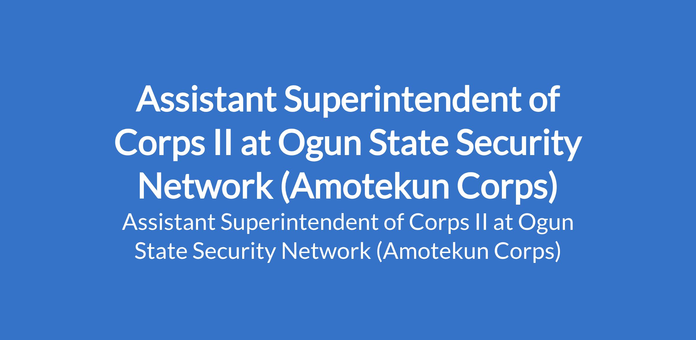 Ogun State Security Network (Amotekun Corps) invites applications from suitably qualified candidates for the position of: Assistant Superintendent of Corps II. Interested candidates should possess a National Diploma (ND) / Senior Secondary Certificate (SSCE) / First School Leaving Certificate (FSLC).