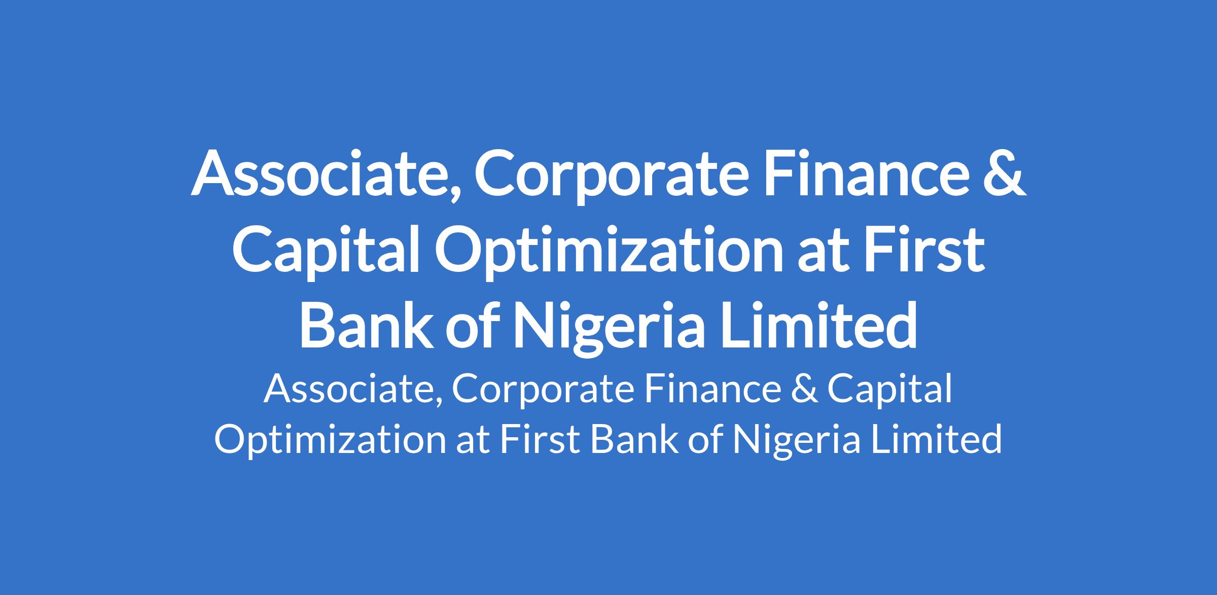First Bank of Nigeria Limited is recruiting to fill the position of: Associate, Corporate Finance & Capital Optimization. Interested candidates should possess a good First Degree, preferably in a numerate discipline with a minimum of 5 years working experience in corporate finance, investment banking, and capital management in Financial Services or related industry.