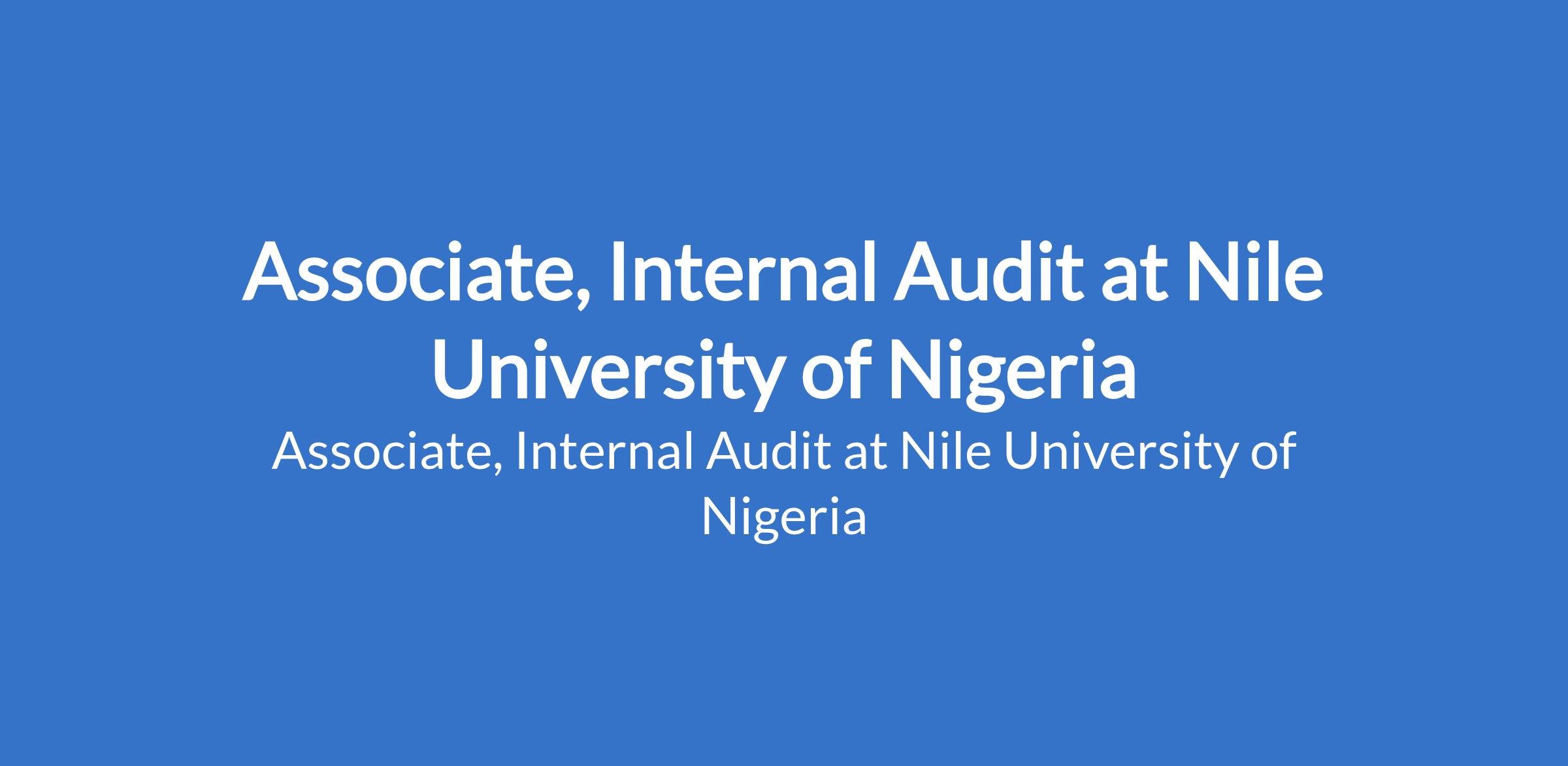 Nile University of Nigeria is recruiting to fill the position of: Associate, Internal Audit. The position is located in Abuja. Interested candidates should possess a Bachelors Degree in Accounting, Finance, Economics, Business Administration, or a related field; ACA / ACCA / CIA / CRMA / CISA (or in progress) with 24 years experience in risk management, internal audit, internal control, compliance, or finance.