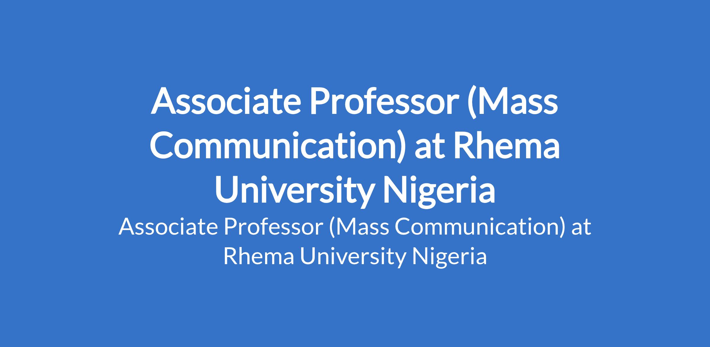 Rhema University Nigeria invites applications from suitably qualified candidates for the position of: Associate Professor (Mass Communication). The position is located in Aba, Abia State. Interested candidates should possess a Ph.D. Degree with eight years post qualification experience and acceptable number of publications.