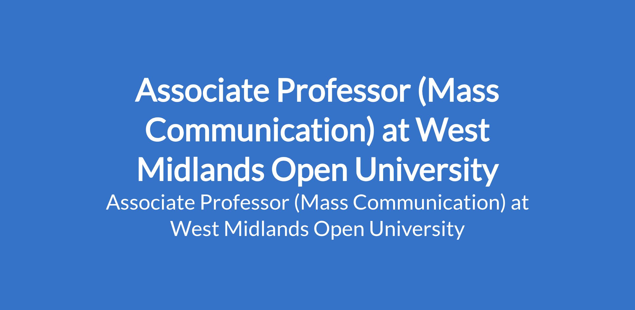 West Midlands Open University invites applications from suitable candidates to fill the position of: Associate Professor (Mass Communication). The position is located in Ikeja, Lagos State. Interested candidates should possess a Ph.D Degree with three years experience as a Senior Lecturer.