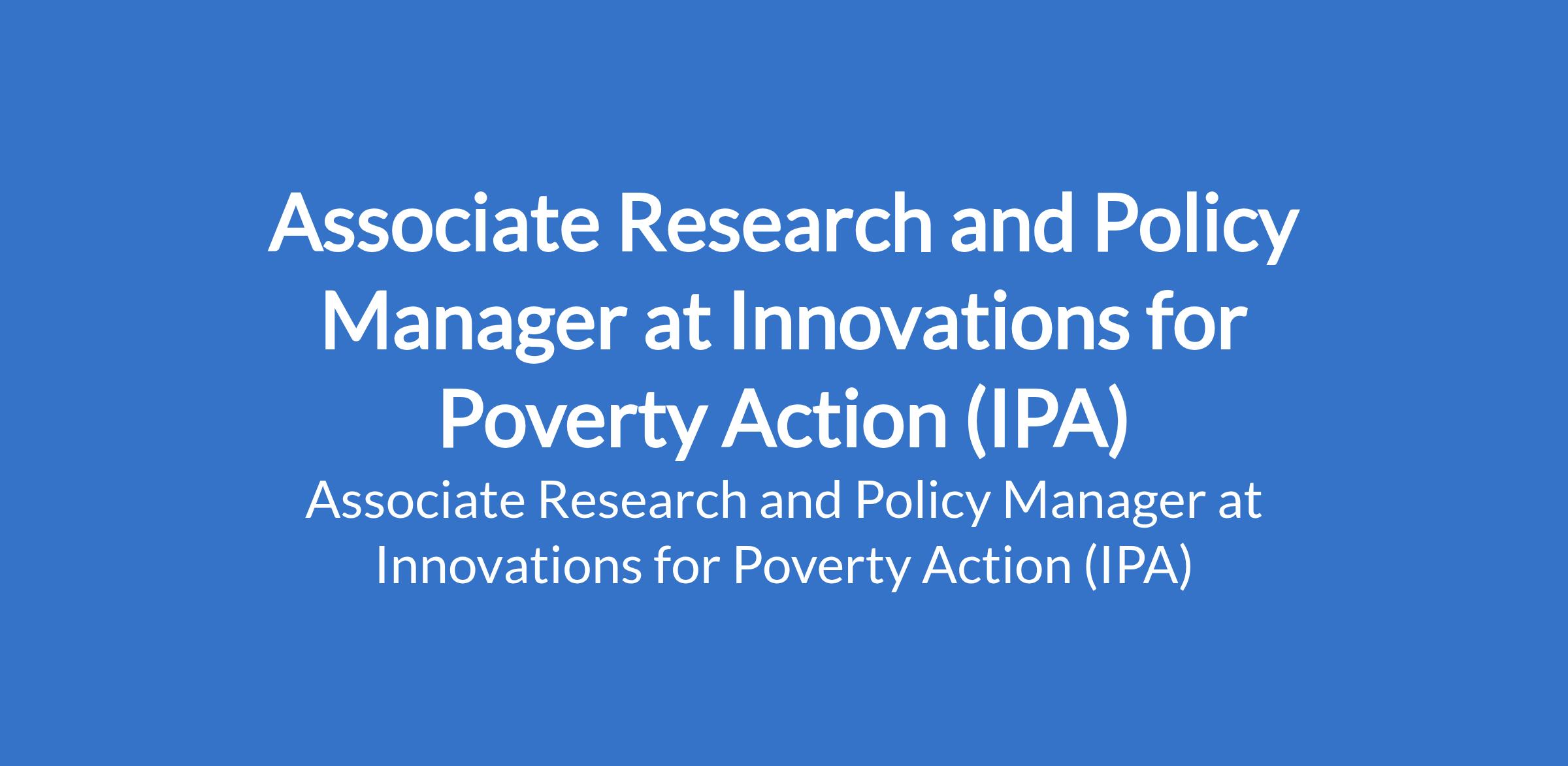 Innovations for Poverty Action (IPA) is recruiting to fill the position of: Associate Research and Policy Manager. Interested candidates should possess a Masters Degree in International Public Policy, Economics, Statistics, Data science, Social Sciences or a related field with 57 years of relevant professional experience.