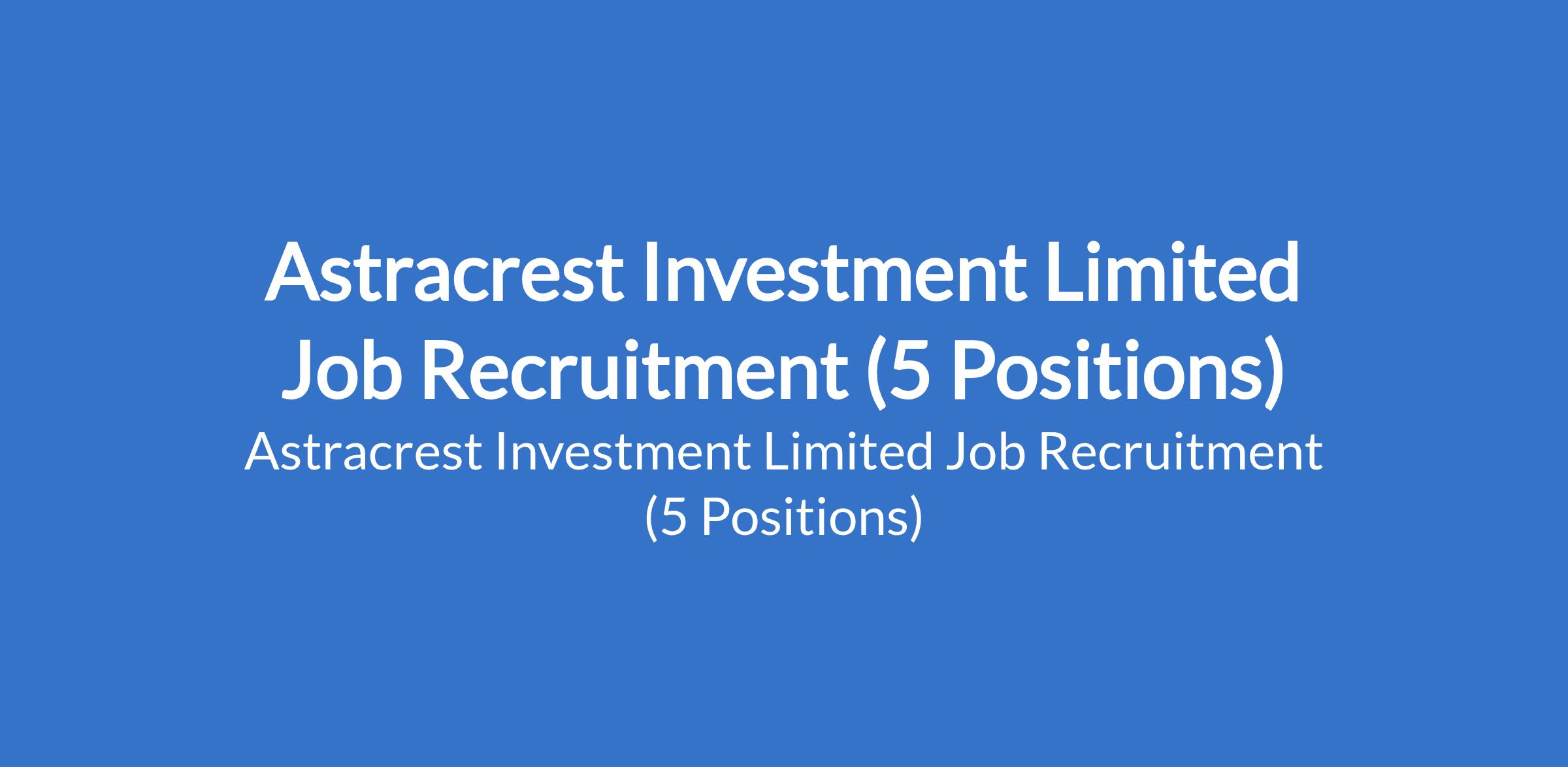 Astracrest Investment Limited is recruiting suitably qualified candidates to fill the following positions in Lagos State: Legal Officer / Legal Counsel, Accountant, Agronomist (Oil Palm, Coconut & Plantain Specialist), Front Desk Officer, and Social Media Manager.