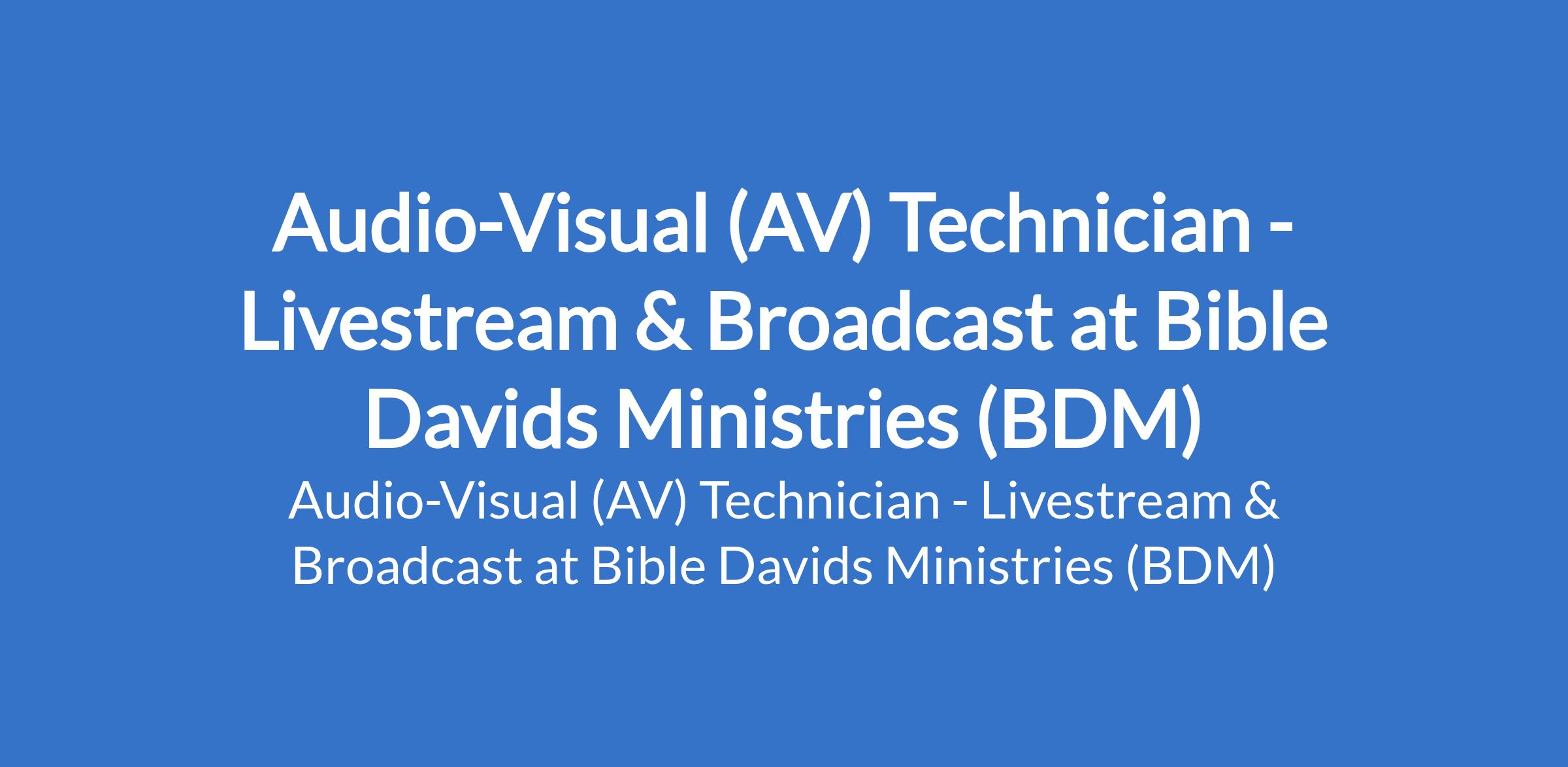 Bible Davids Ministries (BDM) is recruiting to fill the position of: Audio-Visual (AV) Technician - Livestream & Broadcast. The position is located in Abuja. Interested candidates should possess a Bachelors Degree or certification in Broadcast Engineering, Media Technology, or a related field with 35 years of experience in broadcast, livestream, or media production environments.