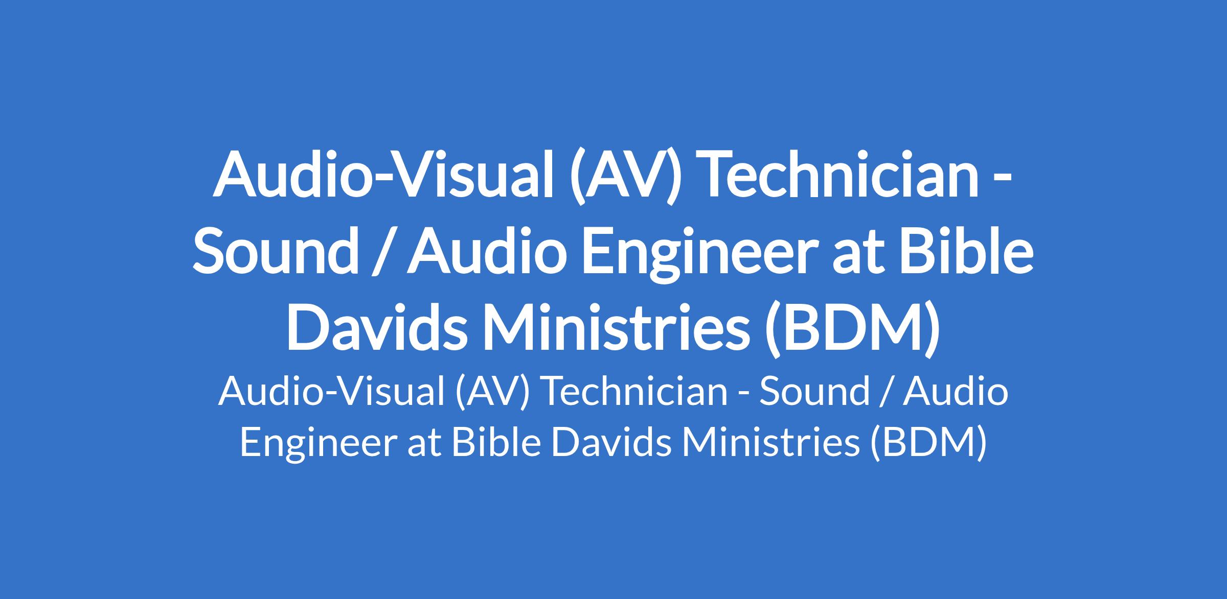Bible Davids Ministries (BDM) is recruiting to fill the position of: Audio-Visual (AV) Technician - Sound / Audio Engineer. The position is located in Abuja. Interested candidates should possess a Bachelors degree or certification in Audio Engineering, Sound Production, or a related field with 35 years of experience in live sound, broadcast, or studio environments.