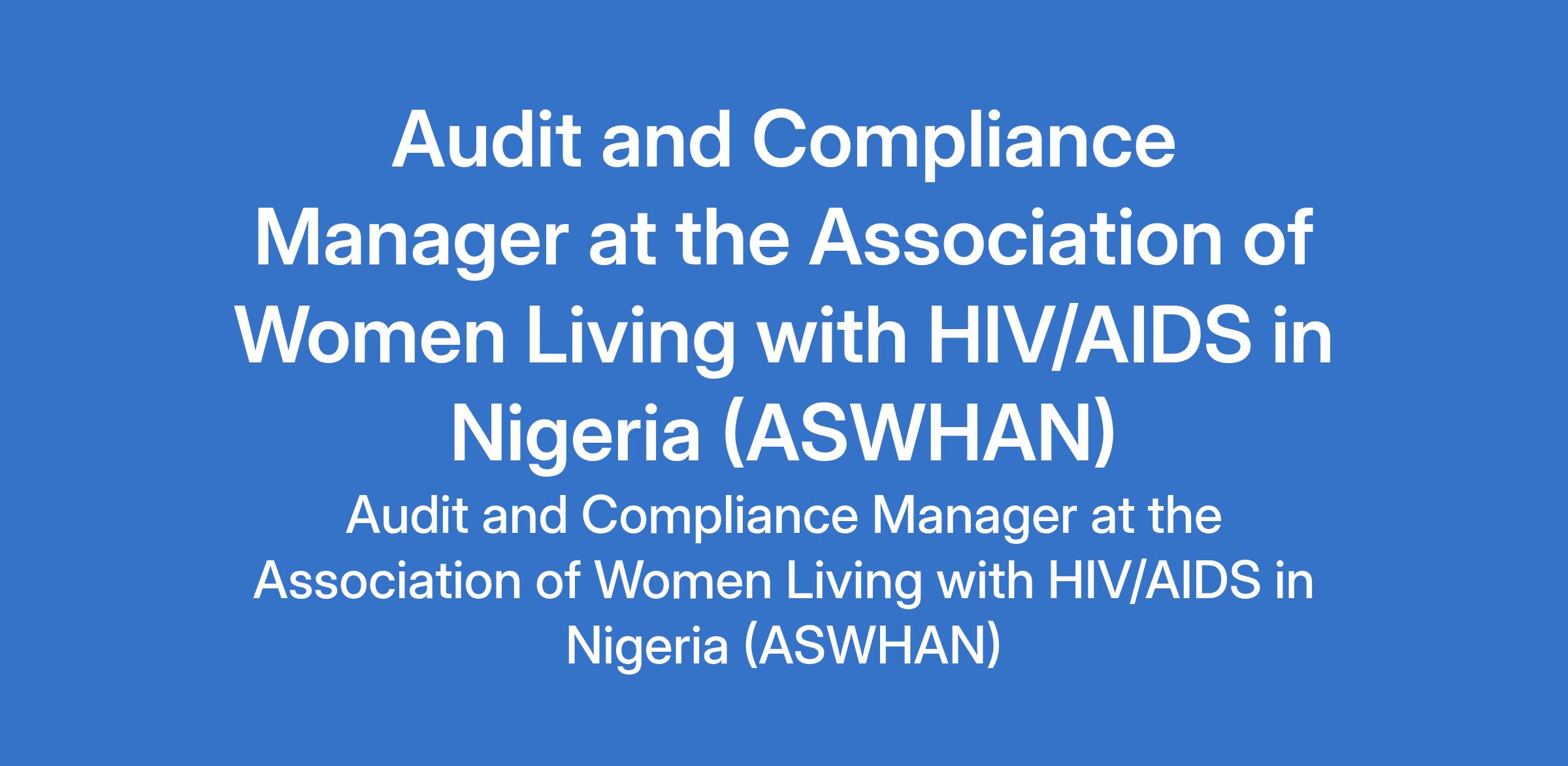 The Association of Women Living with HIV/AIDS in Nigeria (ASWHAN) is recruiting to fill the position of: Audit and Compliance Manager. The position is located in Abuja. Interested candidates should possess a Bachelors degree in Accounting, Finance, Audit, or related field with a minimum 7 years experience in audit, compliance, or risk management roles.