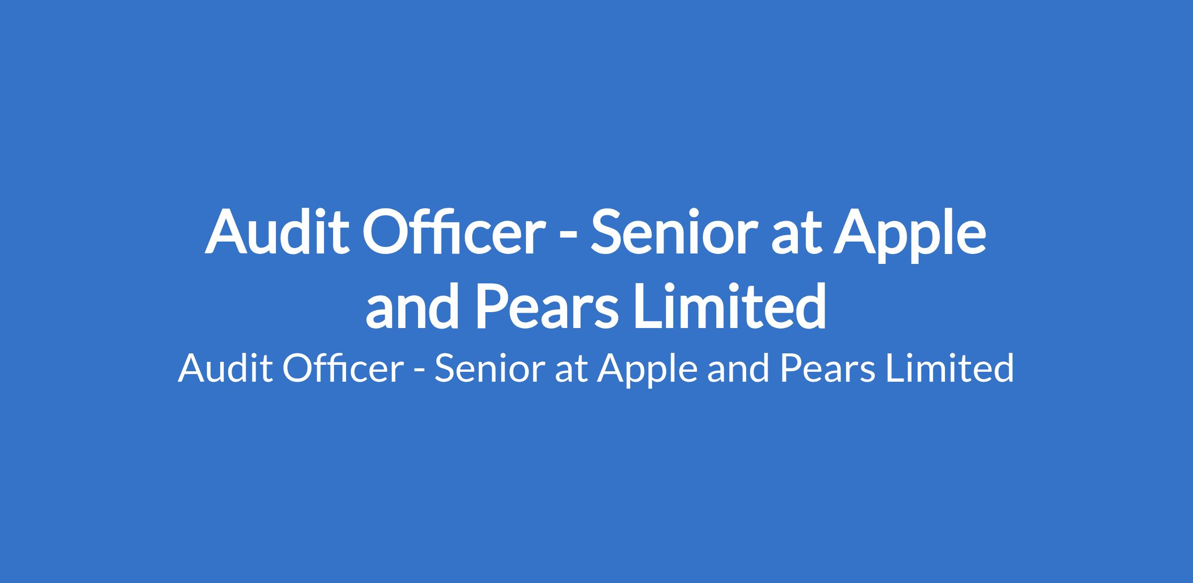 Apple and Pears Limited is recruiting to fill the position of: Audit Officer - Senior. The position is located in Sagamu, Ogun State. Salary: N170,000 - N200,000 monthly. Interested candidates should possess an HND / B.Sc. in Accounting, Finance, or related discipline with 35 years relevant experience in manufacturing or audit.