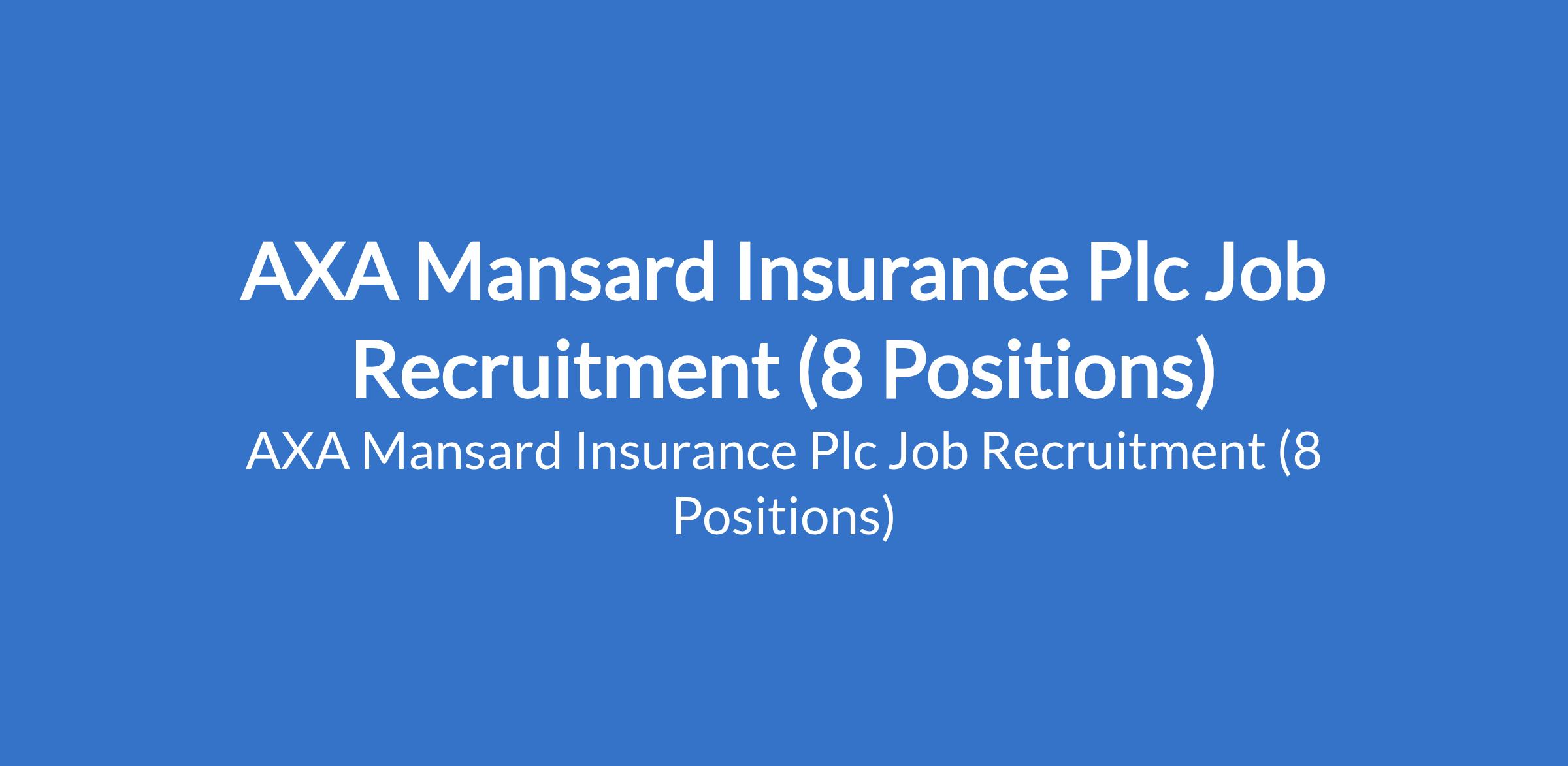 AXA Mansard Insurance Plc is recruiting suitably qualified candidates to fill the following positions in Abuja, Lagos and Rivers State: Head, Physical Security, Health & Safety; Quality & Data Assurance Officer; Closed File Review Officer; Investors Relation & Performance Management Officer; Team Lead, I.T Service Continuity Manager; and Brand & Communication Officer.