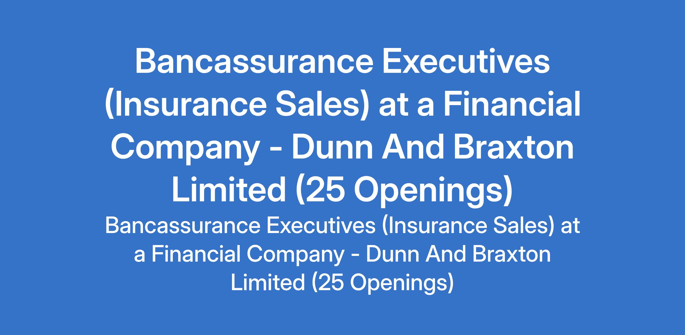 Dunn And Braxton Limited - Our client, Financial firm is recruiting to fill the position of: Bancassurance Executives (Insurance Sales). The position is located in Lagos;Ibadan - Oyo;Abeokuta, Sagamu, Ijebu-Ode - Ogun;Ile-Ife, Osogbo - Osun;Akure - Ondo;Ilorin - Kwara;Lokoja - Kogi; Minna - Niger;Nasarawa; Jos -Plateau; Kano; Kaduna;Enugu;Onitsha, Awka - Anambra;Owerri - Imo; Port-Harcourt - Rivers;Warri, Asaba - Delta;Benin City - Edo; Uyo - Akwa Ibom;and Calabar - Cross Rivers States. Salary: N136,000 per month. Interested candidates should possess a good First-degree or equivalent education with a minimum of 2 years post NYSC work experience with at least 1 year of experience in Insurance Sales.