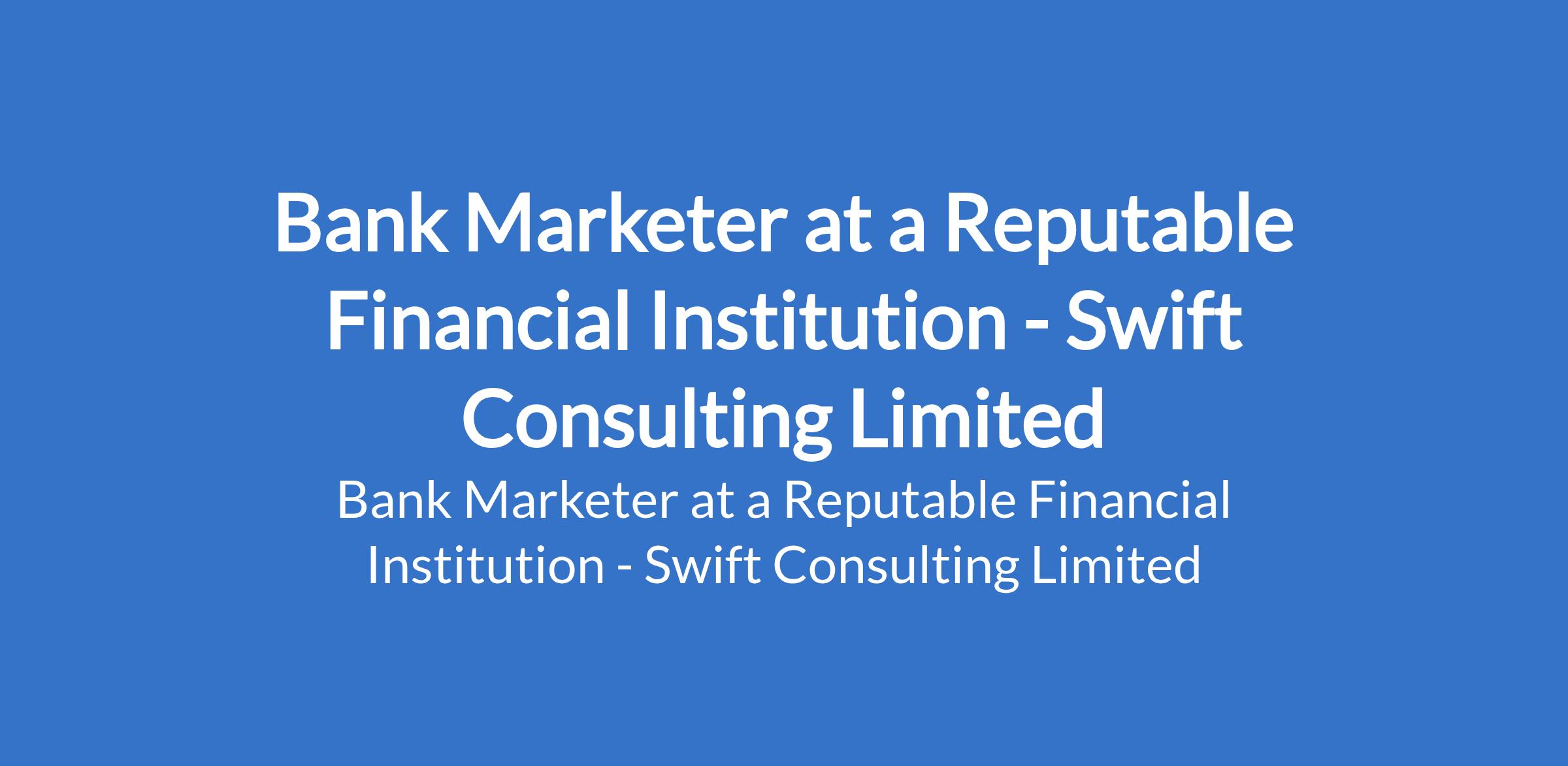 Swift Consulting Limited - Our client, a reputable financial institution, is recruiting to fill the position of: Bank Marketer. The position is located in Apapa, Lagos State. Interested candidates should possess a Bachelors Degree in Business Administration, Finance, Economics, Marketing, or a related field with 13 years of experience in banking, sales, or customer relationship management (an added advantage).