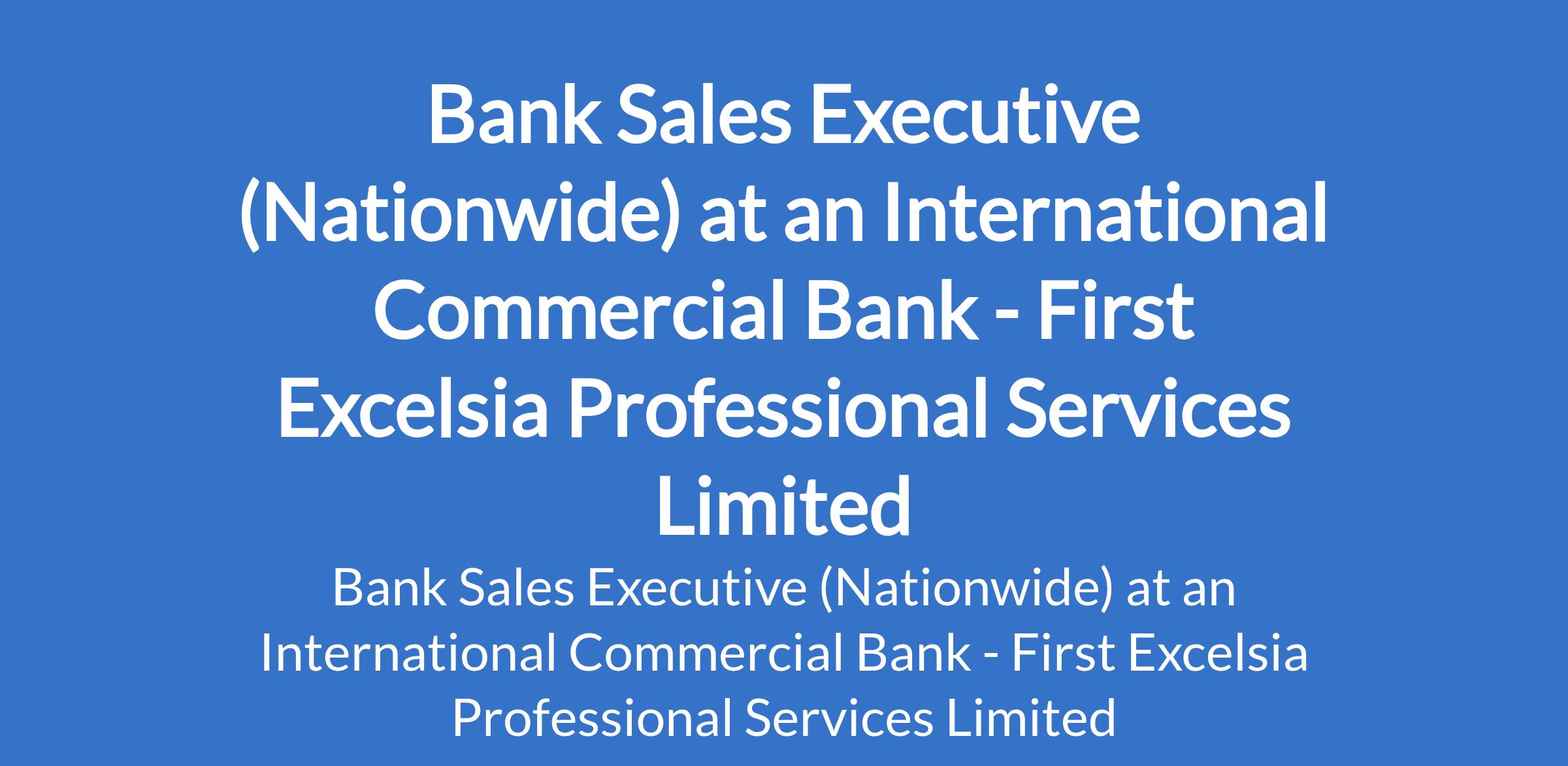 FirstExcelsia Professional Services Limited - Our client, an international commercial bank is recruiting to fill the position of: Bank Sales Executive. The position is required nationwide. Salary: N120,000 monthly. Interested candidates should possess an OND / HND / Bachelors Degree in a relevant field with 13 years experience in banking or financial sales.