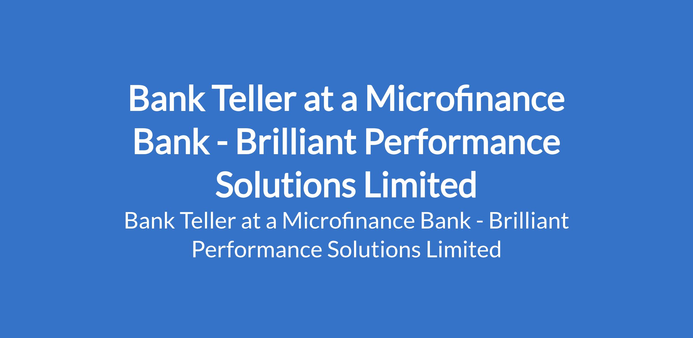 Brilliant Performance Solutions Limited - Our client, a Microfinance Bank is recruiting to fill the position of: Bank Teller. The position is located in Ipaja, Lagos State. Interested candidates should possess relevant qualifications and must have worked or still working with a Microfinance Bank for a period not less than 2 years, and should live in areas that are within Ipaja in Lagos State.