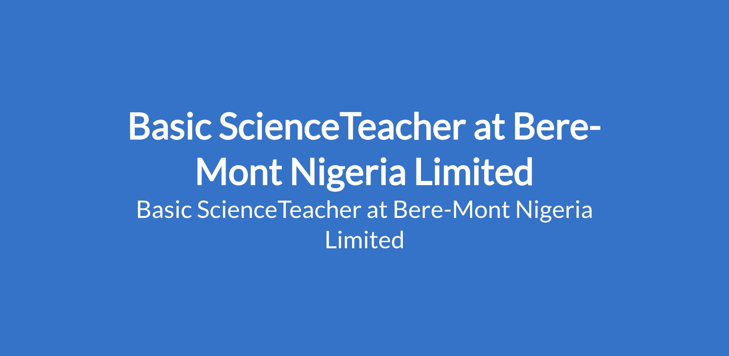 Bere-Mont Nigeria Limited is recruiting to fill the position of: Basic ScienceTeacher. The position is located in Igwuruta, Port Harcourt, Rivers State. Interested candidates should possess a minimum of a First Degree in the subject area; B.Sc / NCE / B.Sc (Ed) / B.Ed / PGDE / M.Ed with a minimum of 3 years of teaching experience in the area of specialization.