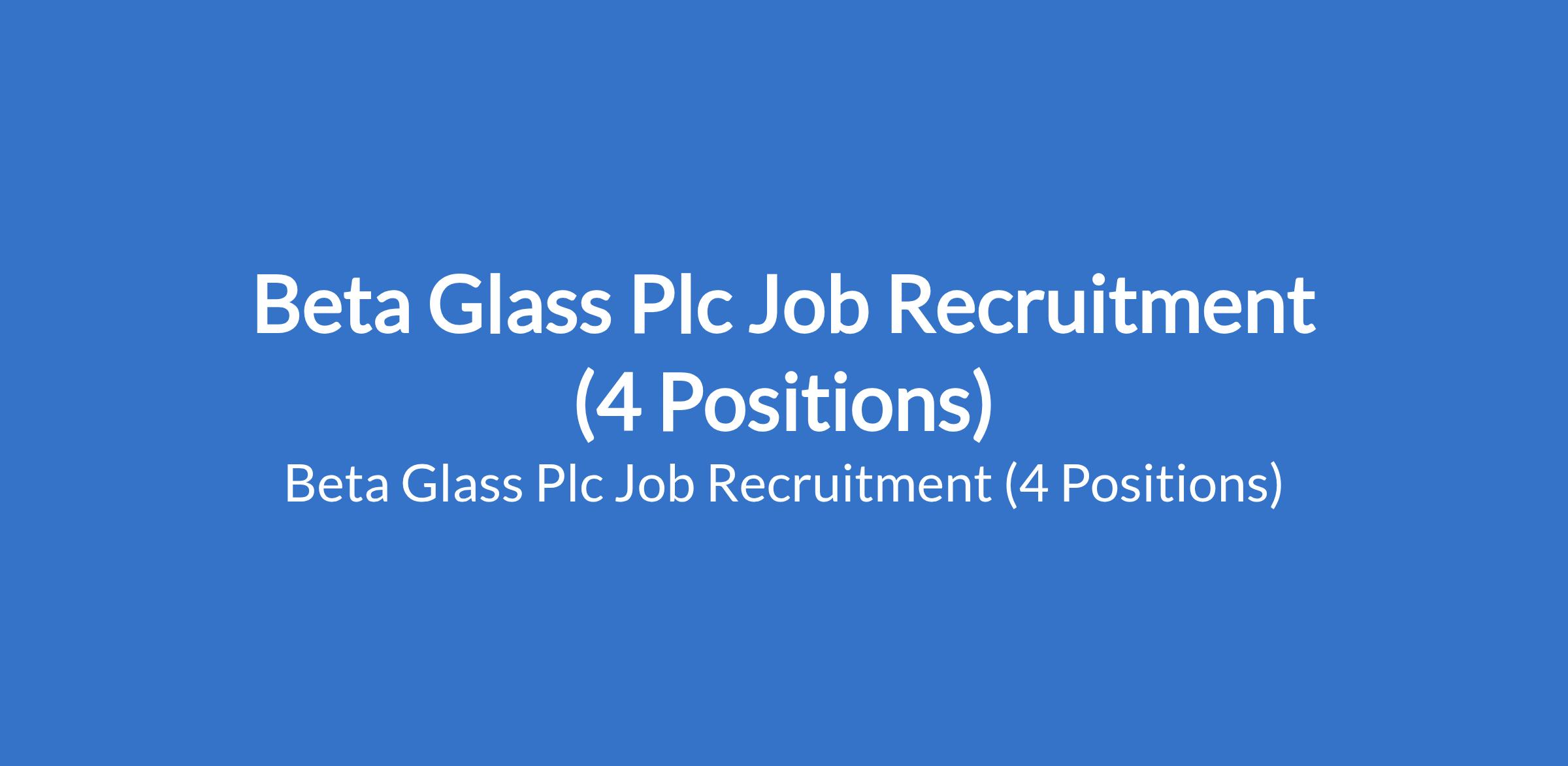 Beta Glass Plc is recruiting suitable candidates to fill the following positions in Lagos, Delta and Ogun States: Corporate Communications Manager, Instrumentation Maintenance Specialist, Individual Section (I.S) Maintenance Specialist, and Cold End Maintenance Specialist.