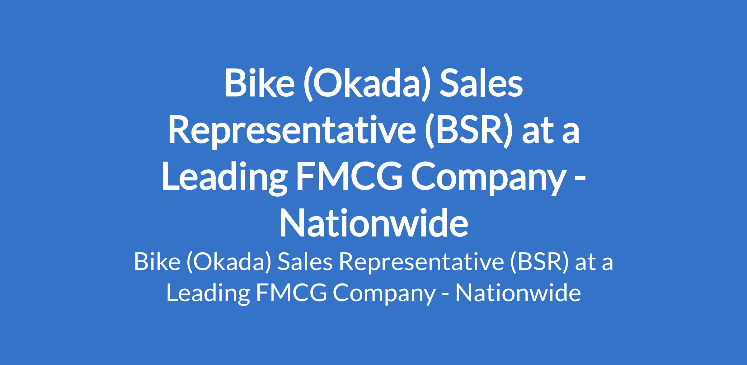 A Leading FMCG Company is recruiting to fill the position of: Bike (Okada) Sales Representative (BSR). This position is required Nationwide. Salary: N104,692 monthly. Interested candidates should possess an OLevel / OND qualification or equivalent with FMCG sales experience.