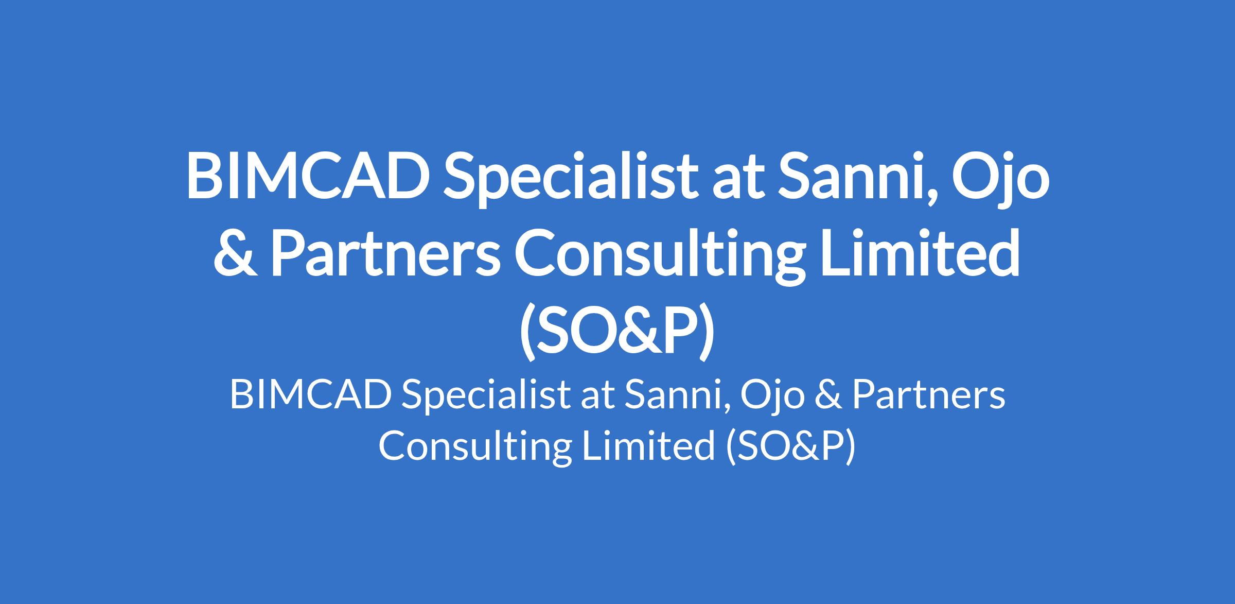 Sanni, Ojo & Partners Consulting Limited (SO&P) is recruiting to fill the position of: BIMCAD Specialist. The position is located in Shomolu, Lagos State. Salary: N180,000 - N400,000 / month. Interested candidates should possess roficiency in AutoCAD, CADS-RC, CADS-SW, and Revit; familiarity with Civil 3D and BIM coordination tools is an added advantage with 25 years hands-on experience in structural/civil drafting or detailing.