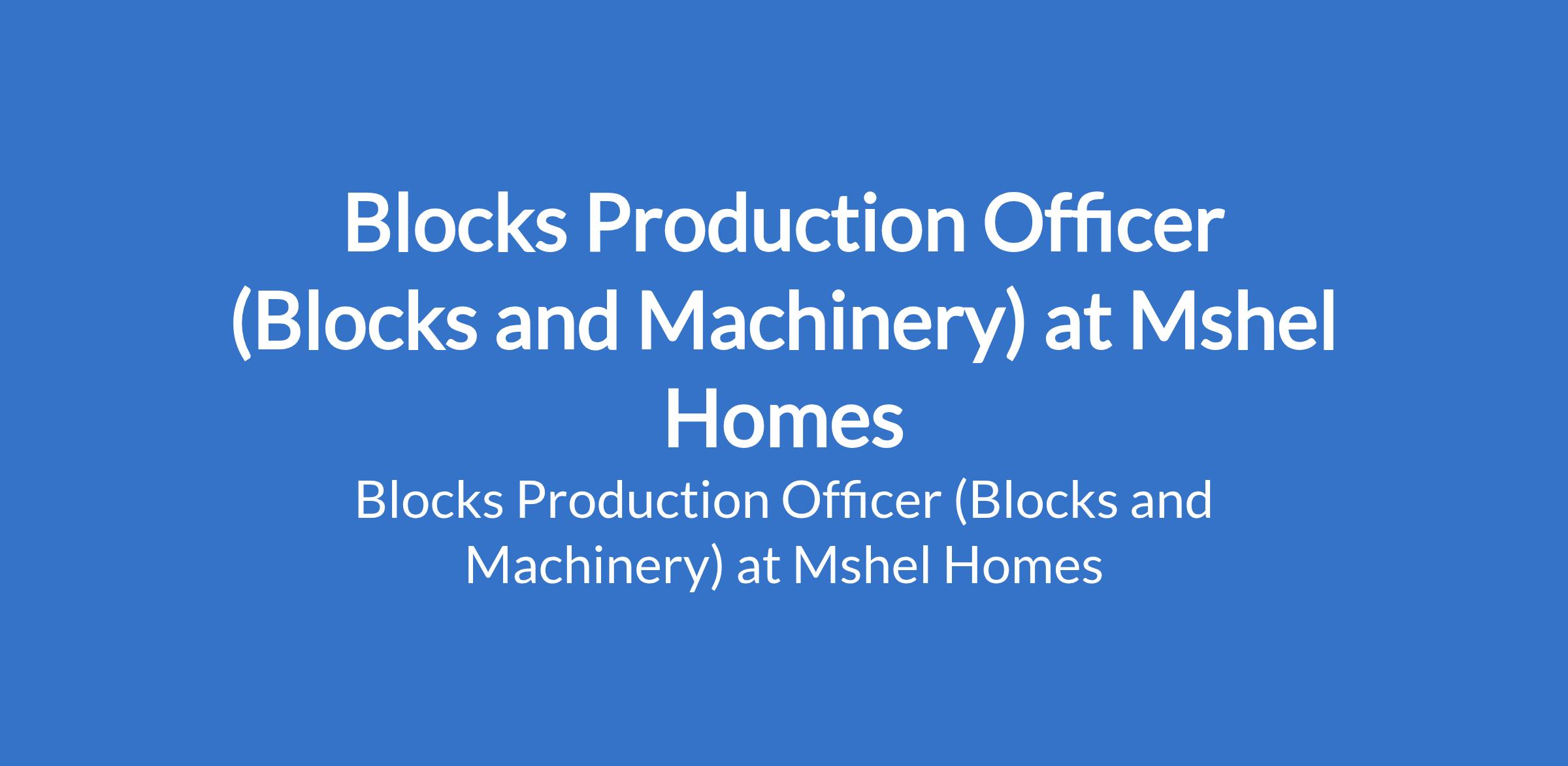 Mshel Homes Limited is recruiting to fill the position of: Blocks Production Officer (Blocks and Machinery). The position is located in Lagos State. Interested candidates should possess a Bachelors Degree in manufacturing, Industrial Engineering, or a related field with 2-3 years of experience in the production of blocks and troubleshooting of machinery.
