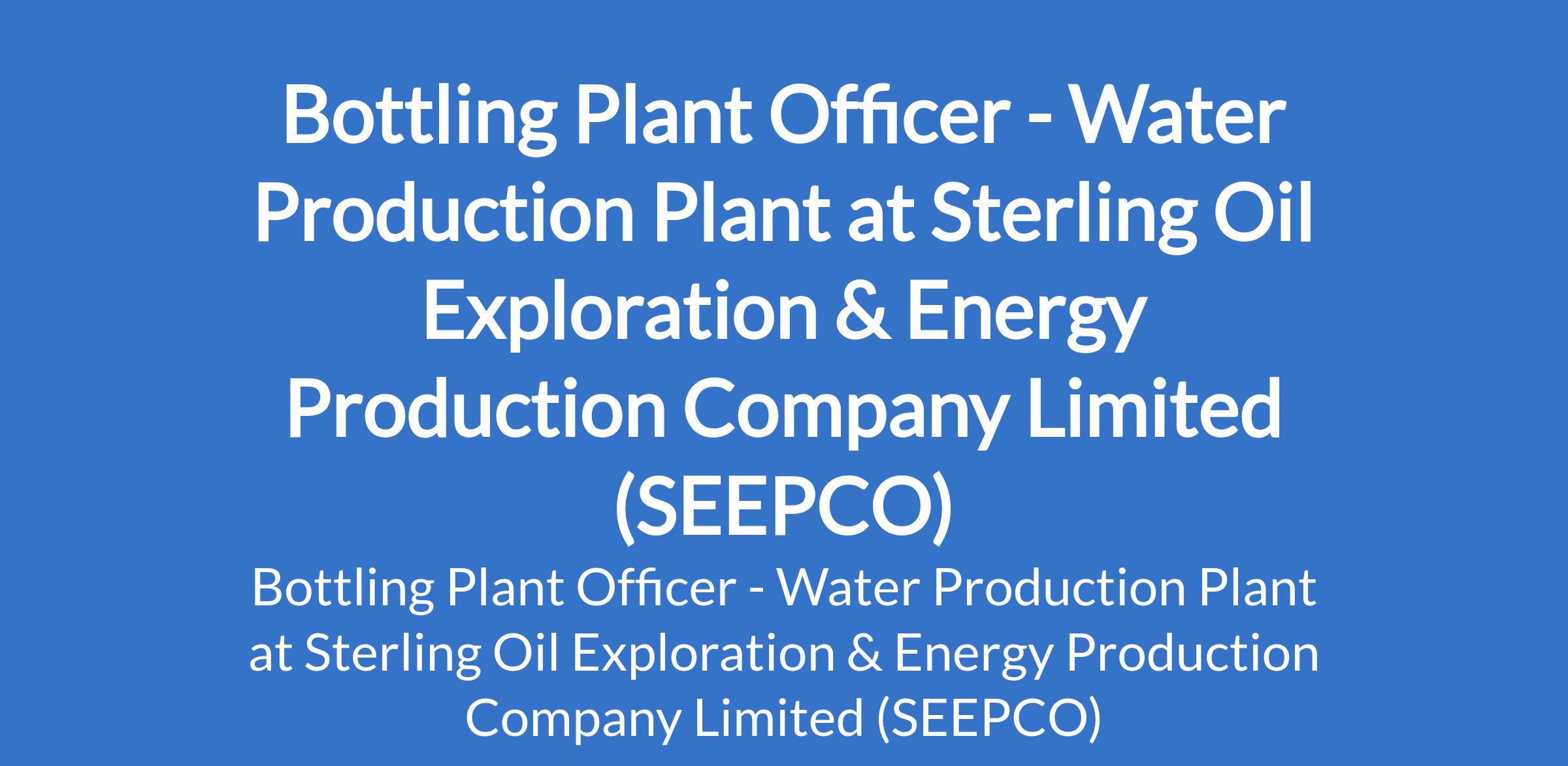 Sterling Oil Exploration & Energy Production Company Limited (SEEPCO) is recruiting to fill the position of: Bottling Plant Officer. The position is located in Lagos State. Interested candidates should possess an ITI / Diploma in Mechanical / Electrical Engineering with 1015 years of experience in bottled water / beverage / food processing plant. Experience in automatic bottling lines.