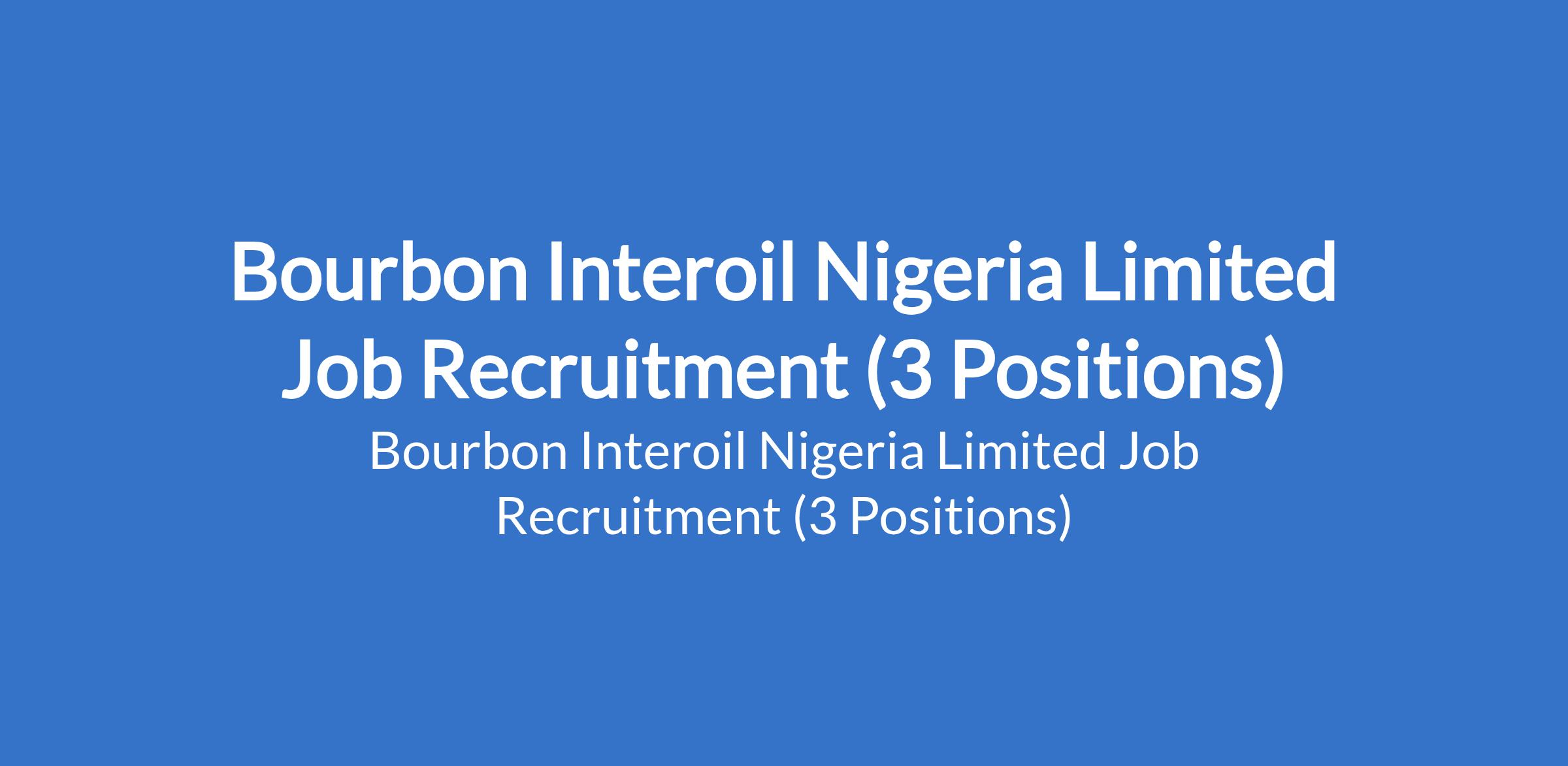 Bourbon Interoil Nigeria Limited is recruiting suitably qualified candidates to fill the following positions in Rivers State: HRBP & ER / IR, Employee Communications Manager; Senior HRBP / Performance, Reward & HR Services Manager; and HSE Coordinator.