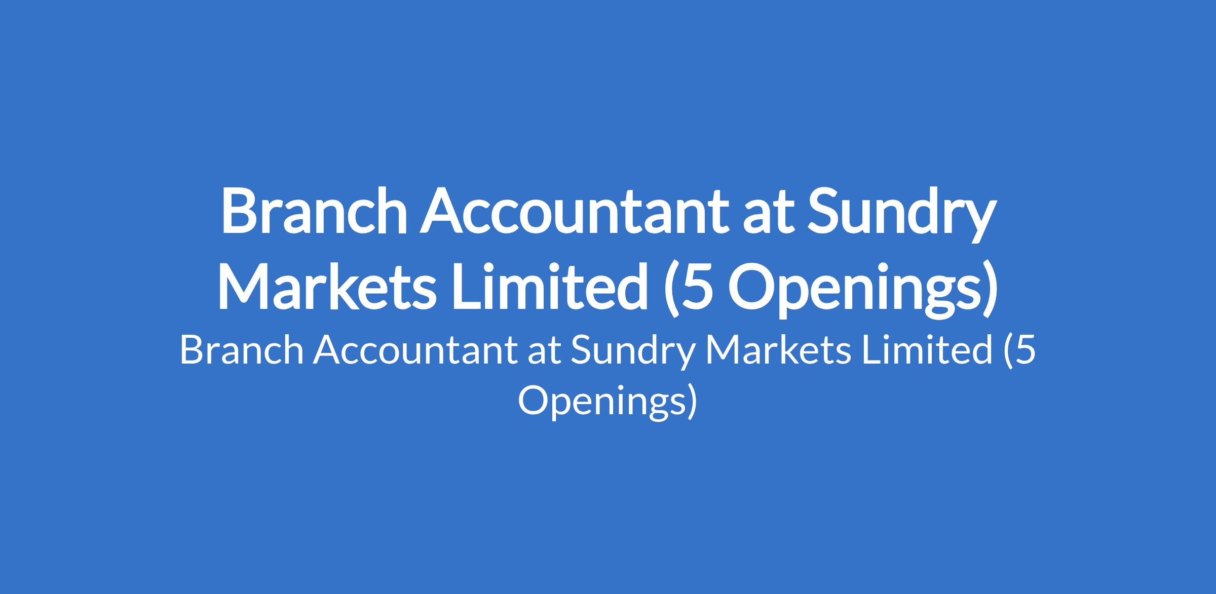 Sundry Markets Limited is recruiting to fill the position of: Branch Accountant. The position is located in Abuja (FCT), Anambra, Delta, Edo, and Lagos States. Interested candidates should possess minimum of a B.Sc. / HND qualification in Accountancy or related fields with a minimum of 4 years experience in similar roles, and must have NYSC Discharged, Exemption or Exclusion letter.