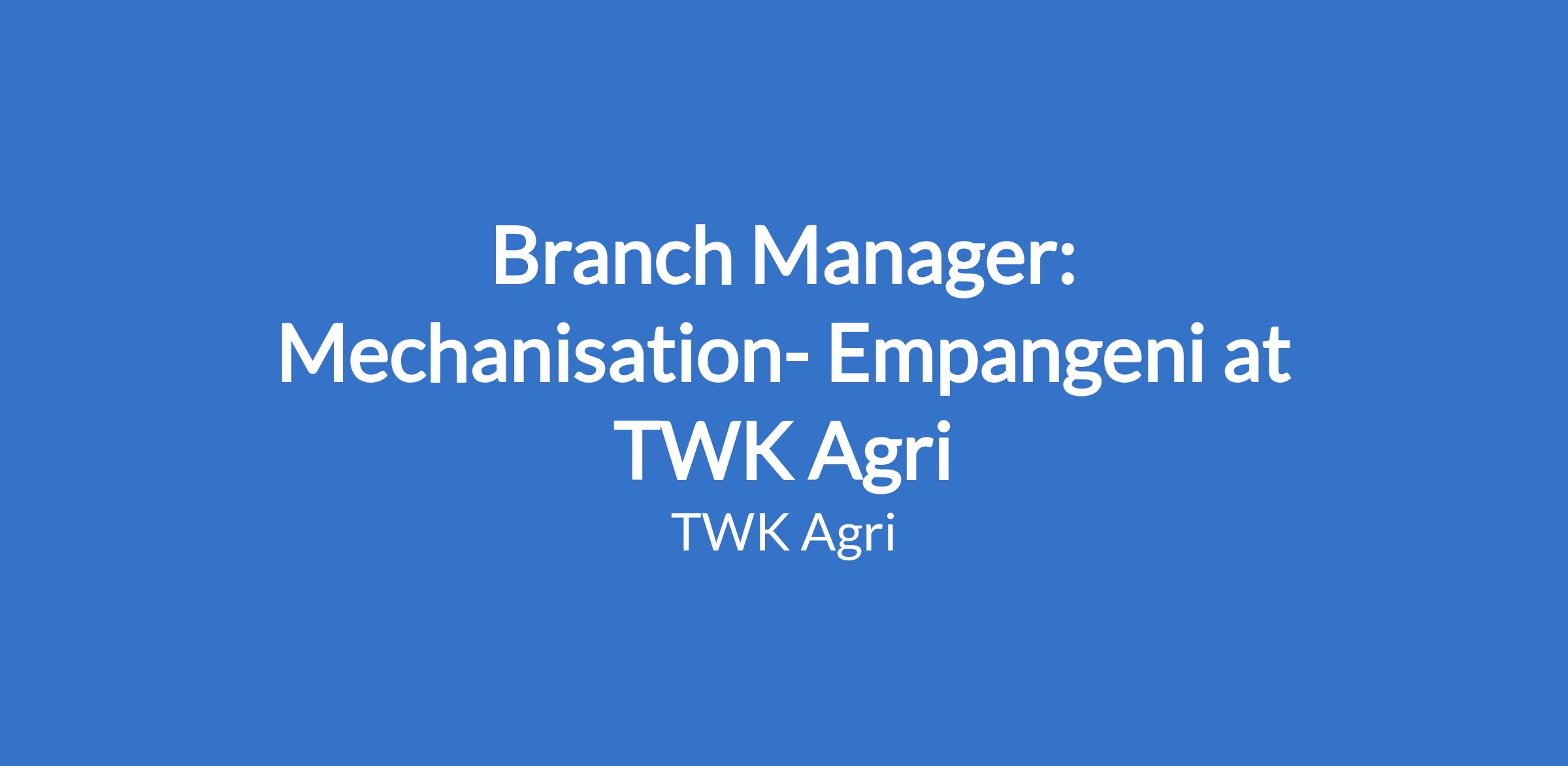 TWK Agri has the following vacancy available: Branch Manager: Mechanisation within the Trade division at Empangeni, KwaZulu-Natal.
