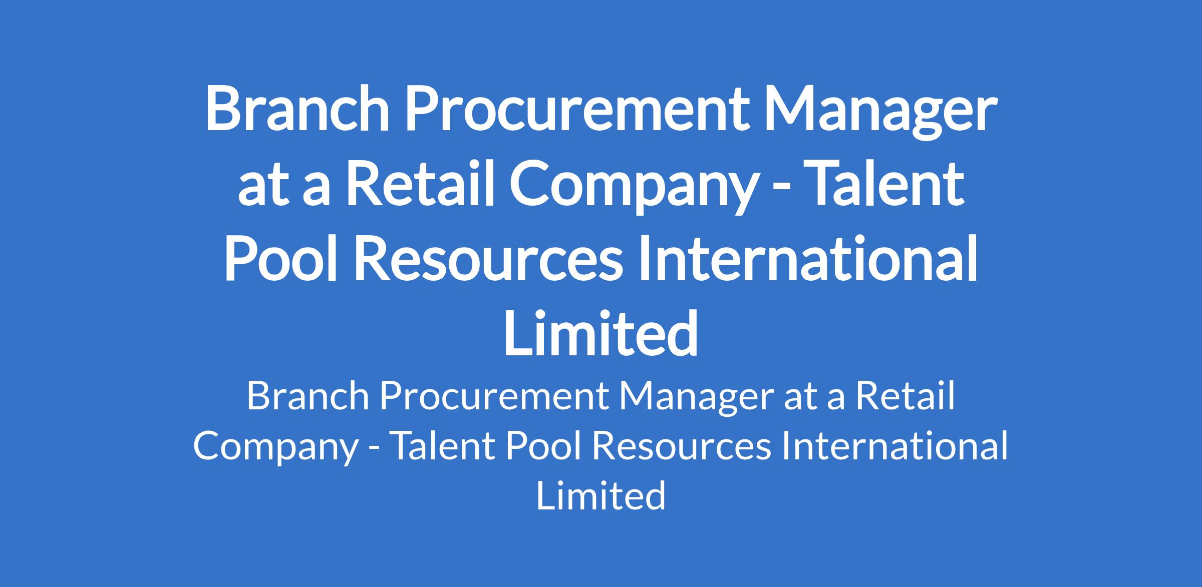 Talent Pool Resources International Limited - Our client, a Retail Company is recruiting to fill the position of: Branch Procurement Manager. The position is located in Berger, Lagos State. Salary: N220,000 N250,000 (Gross) monthly. Interested candidates should possess a Bachelors degree or HND in Business Administration, Supply Chain, or a related field with experience with 35 years of procurement experience in a supermarket or retail environment.