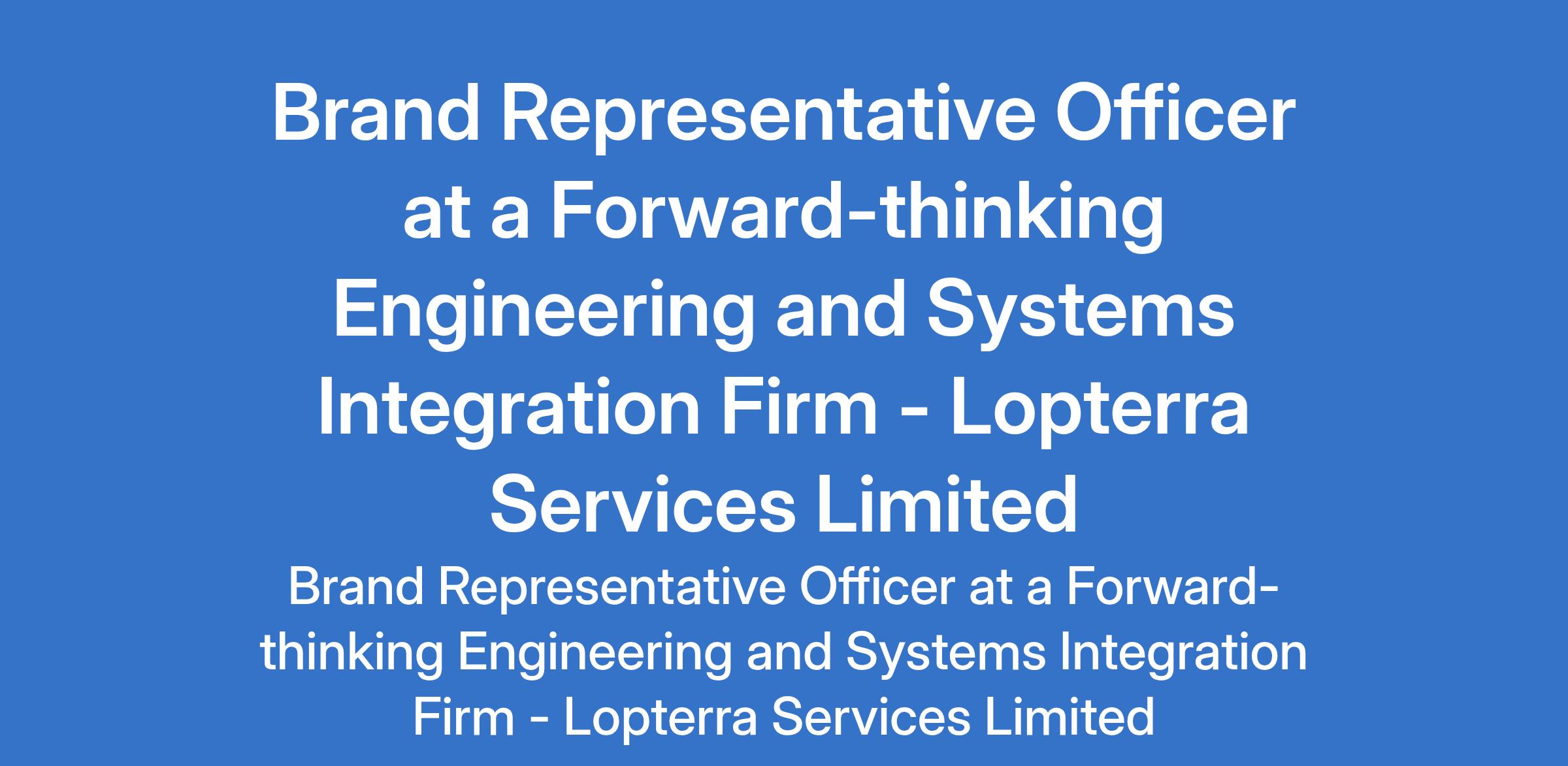Lopterra Services Limited - Our client, a forward-thinking engineering and systems integration firm is recruiting to fill the position of: Brand Representative Officer. The position is located in Lagos State. Salary: N150,000 - N250,000 monthly. Interested candidates should possess a Bachelors Degree in Marketing, Business, Engineering, or a related field with 3+ years of B2B sales experience (preferably in renewable energy).