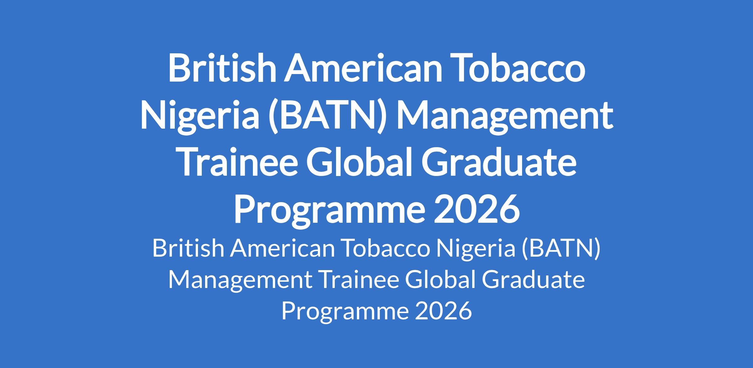 British American Tobacco Nigeria (BATN) invites applications from suitable candidates for its 2026 Management Trainee Global Graduate Programme in Ibadan, Oyo State. The intensive 18-month program aims to groom the next generation of leaders in BAT Operations Team, providing participants with a deep understanding of various operational areas.