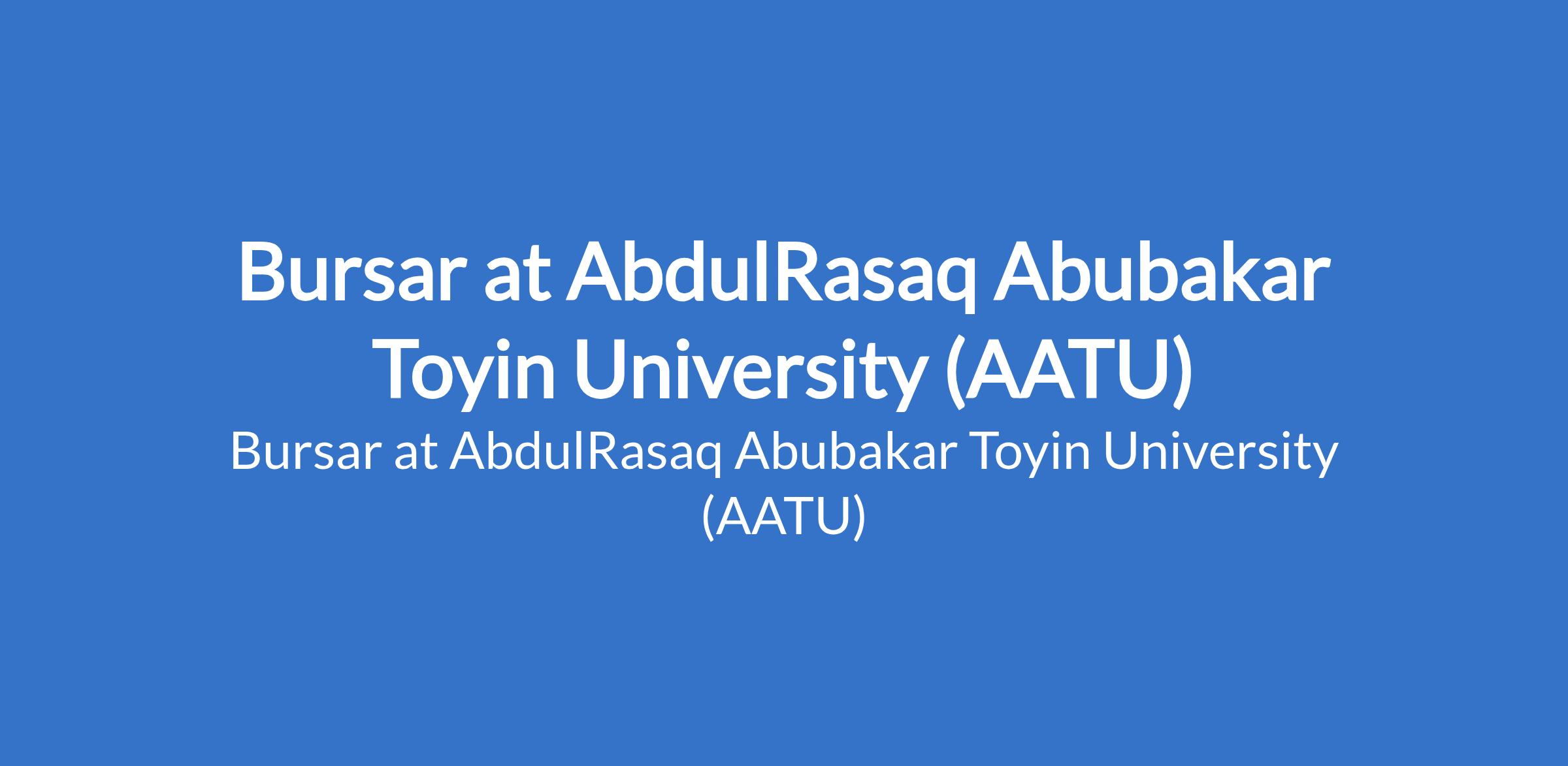 AbdulRasaq Abubakar Toyin University (AATU) invites applications to fill the position of: Bursar. The position is located in Ganmo, Kwara State. Interested candidates should possess good honours Degree (at least 2nd class lower division), preferably in Accounting, Economics, Financial Management, and other related fields or subjects from a recognized Tertiary Institution with at least fifteen (15) years of experience after obtaining their honours Degree and five (5) years of experience following their professional qualification.