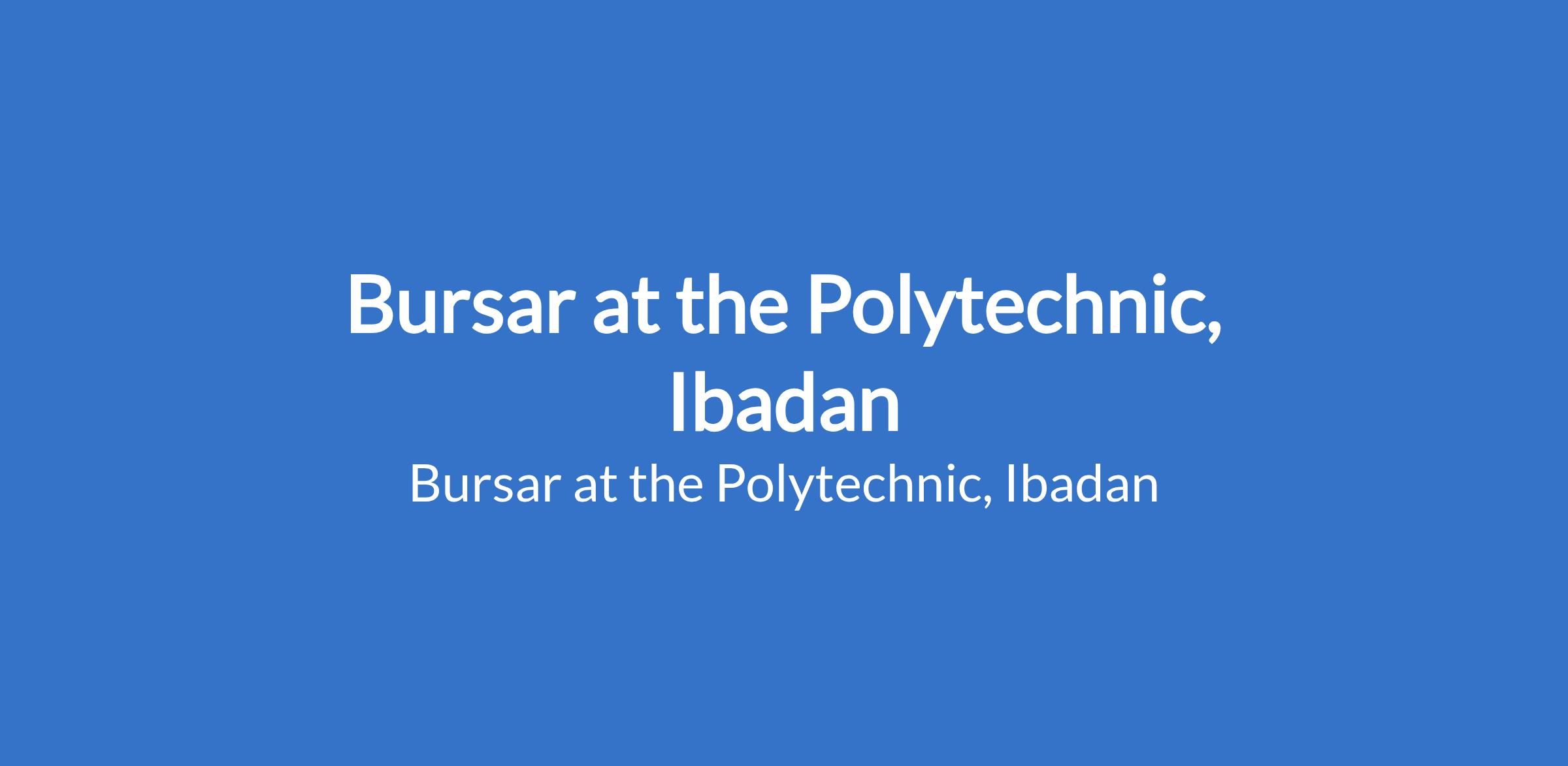 The Polytechnic, Ibadan invites applications from suitable candidates to fill the position of: Bursar. The position is located in Oyo State. Interested candidates should possess a good honour Degree or equivalent qualification in Accounting, Finance, Economics or any related discipline from a recognized Institution, and a Postgraduate Degree at Master's Degree level in relevant discipline a minimum of Fifteen (15) years cognate post qualification experience in a tertiary institution or relevant organization with at least five (5) years' experience as a Chief Accountant or its equivalent.