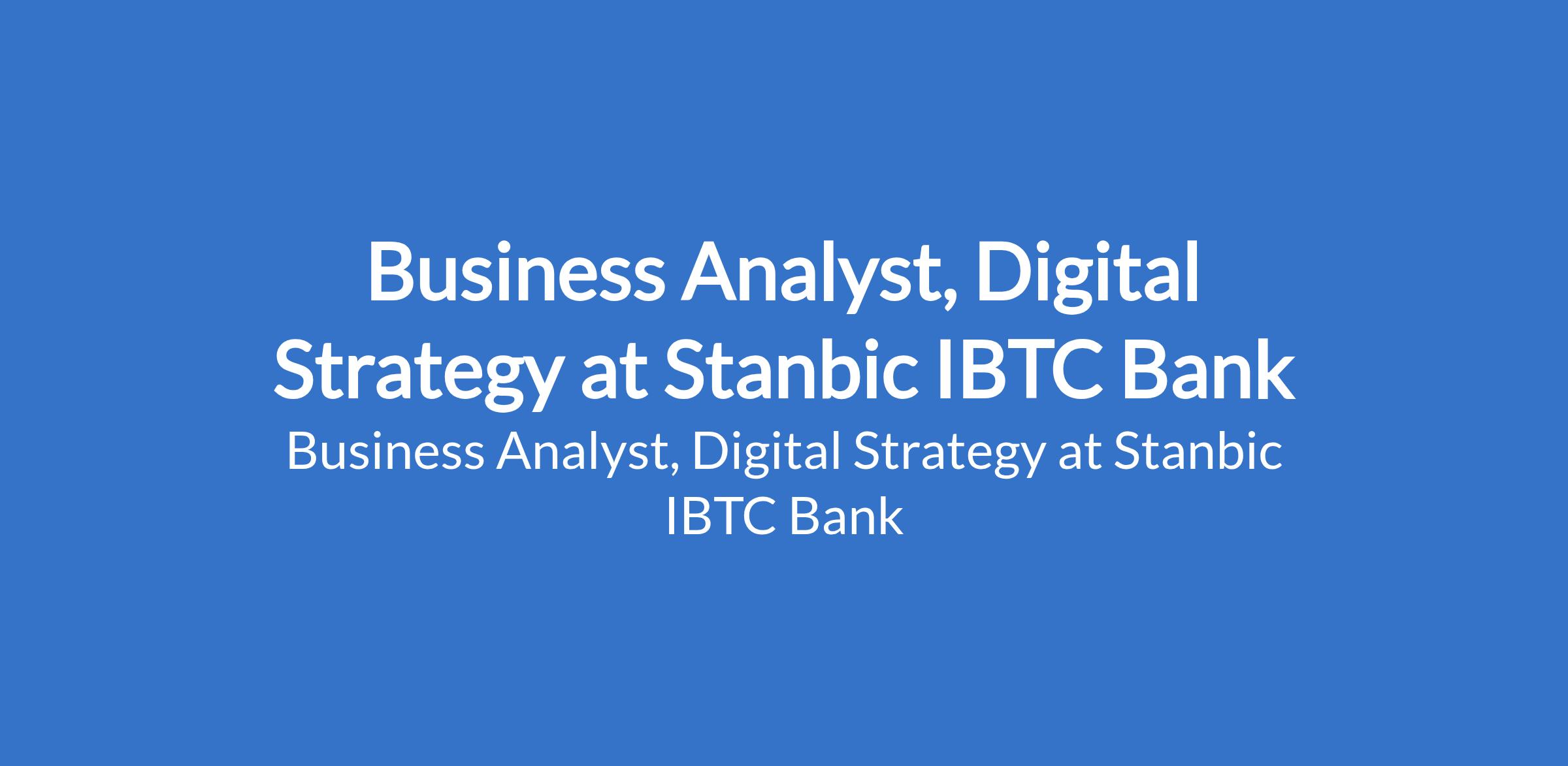 Stanbic IBTC Bank is recruiting to fill the position of: Business Analyst, Digital Strategy. The position is located in Walter Carrington Crescent, Victoria Island, Lagos State. Interested candidates should possess a Bachelors degree in Information Technology, Engineering, Economics, Business Administration or any related field with 2 - 5 years' experience in project management, business analysis, strategy, digital innovation, or technology-driven project delivery.