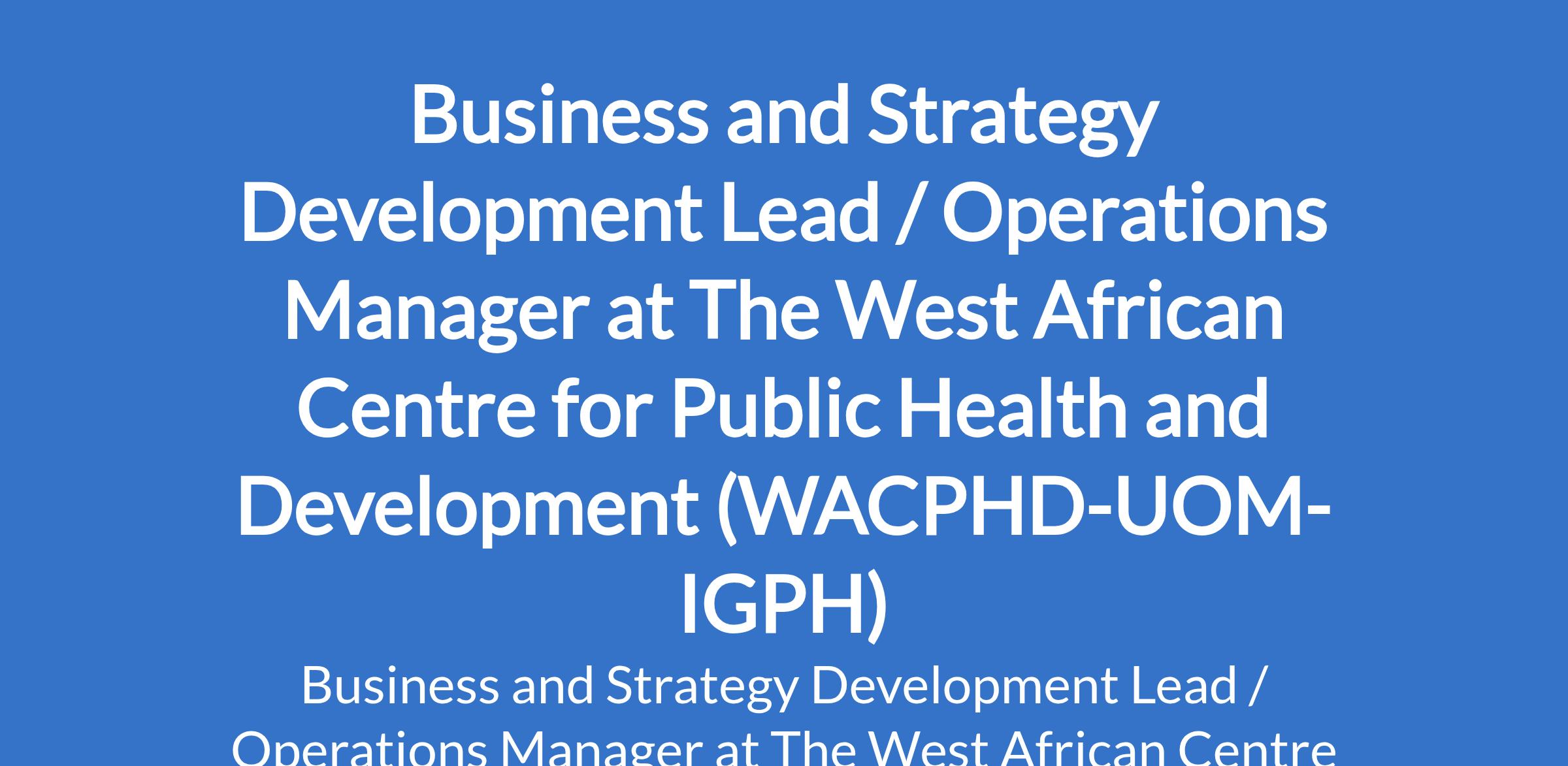 The West African Centre for Public Health and Development (WACPHD-UOM-IGPH) is recruiting to fill the position of: Business and Strategy Development Lead / Operations Manager. The position is located in Abuja (FCT). Interested candidates should possess a Masters degree in Business Administration, Economics, Finance, Management, or a related field (MBA or equivalent preferred) with 8 12 years experience in business development, enterprise management, consulting, or private-sector/for-profit organization engagement.
