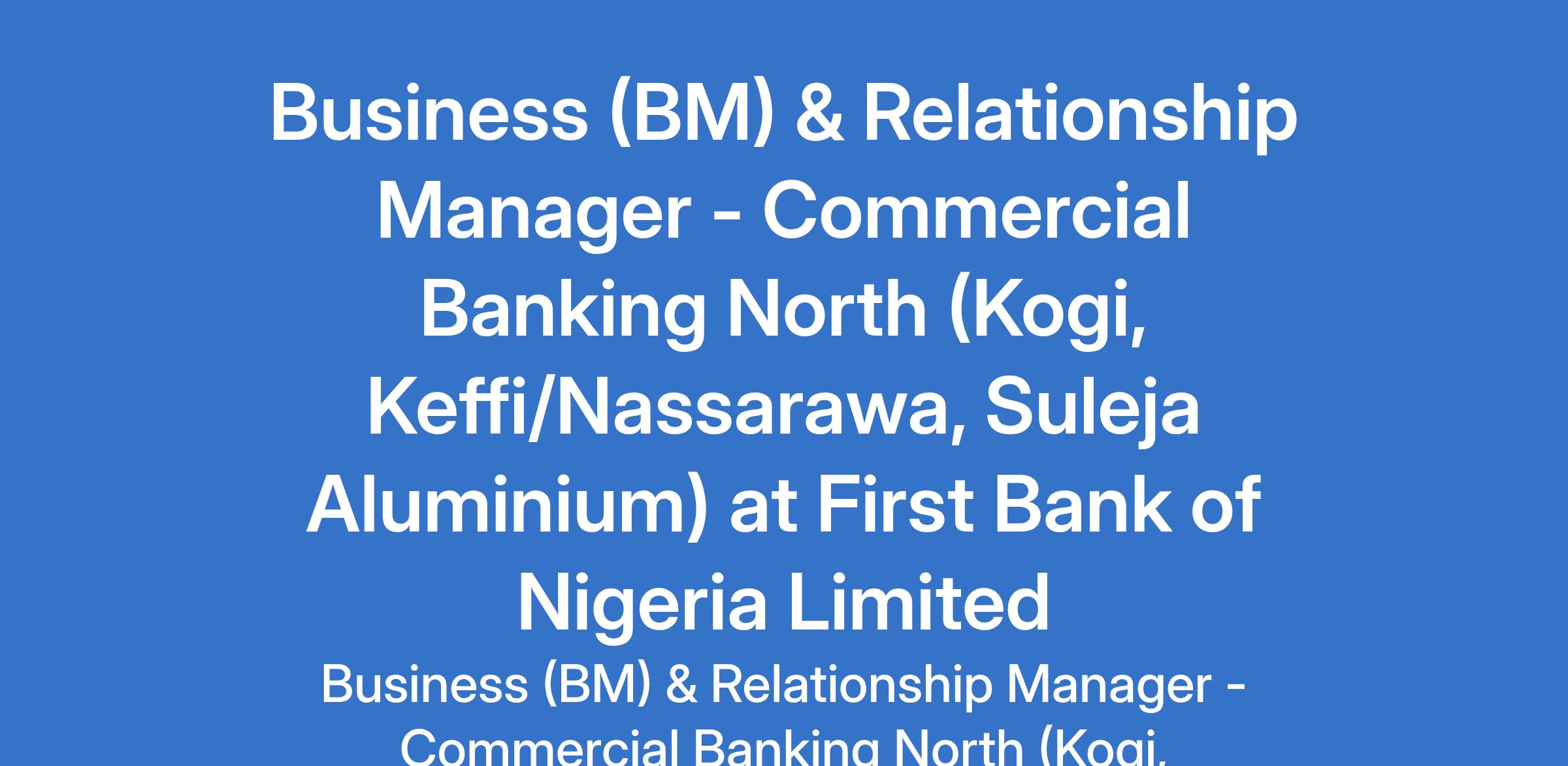First Bank of Nigeria Limited is recruiting to fill the position of: Business (BM) & Relationship Manager - Commercial Banking North (Kogi, Keffi/Nassarawa, Suleja Aluminium). The position is located in Abuja (FCT). Interested candidates should possess a First Degree or its equivalent in any discipline preferably Business-related with 3 years relevant banking (marketing and credit) experience.