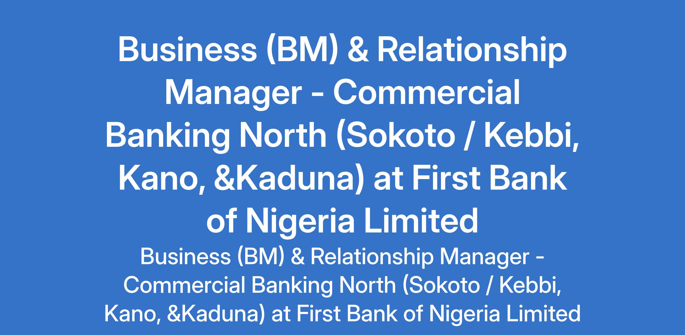 First Bank of Nigeria Limited is recruiting to fill the position of: Business (BM) & Relationship Manager - Commercial Banking North. The position is located in Sokoto / Kebbi, Dawanau - Kano, and Zaria - Kaduna State. Interested candidates should possess a First Degree or its equivalent in any discipline preferably Business-related with 3 years relevant banking (marketing and credit) experience.