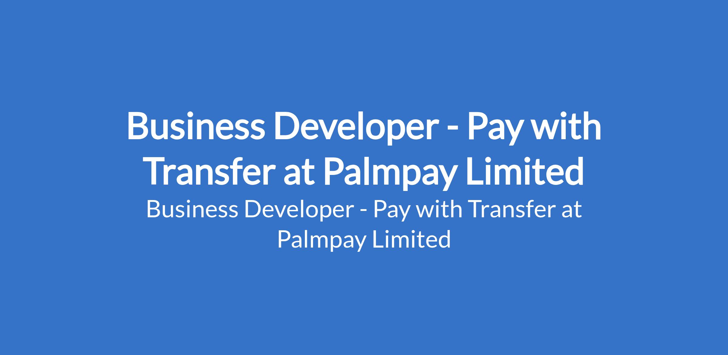 Palmpay Limited is recruiting to fill the position of: Business Developer - Pay with Transfer. The position is located in Port Harcourt - Rivers State. Salary: N70,000 monthly. Interested candidates should possess relevant qualifications and work experience.