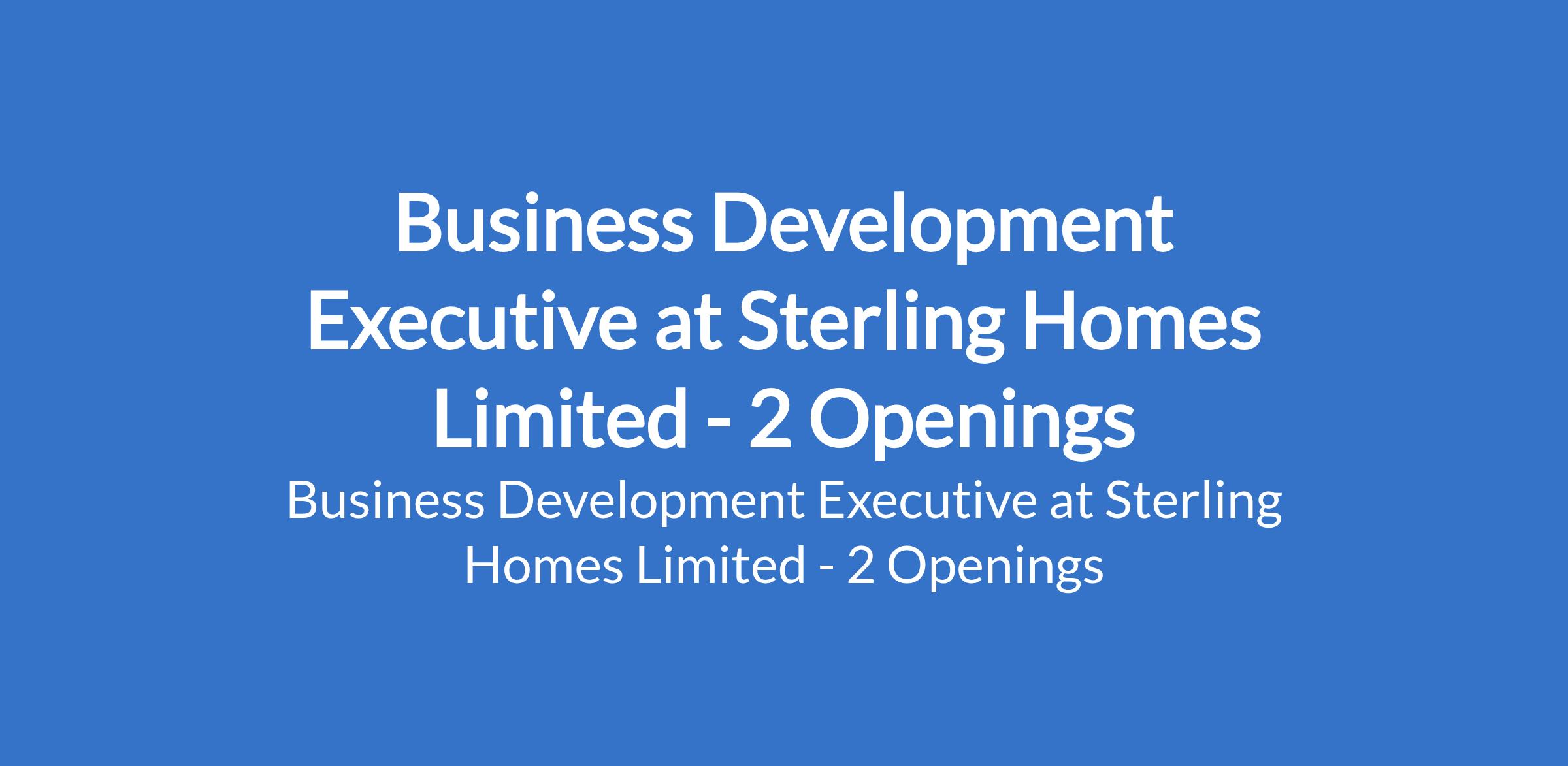 Sterling Homes Limited is recruiting to fill the position of: Business Development Executive. The position is located in Lagos and Kwara States. Salary: N80,000 - N120,000 monthly. Interested candidates should possess a B.Sc Degree / HND qualification in any field (Sales / Marketing background is an advantage) with relevant work experience.