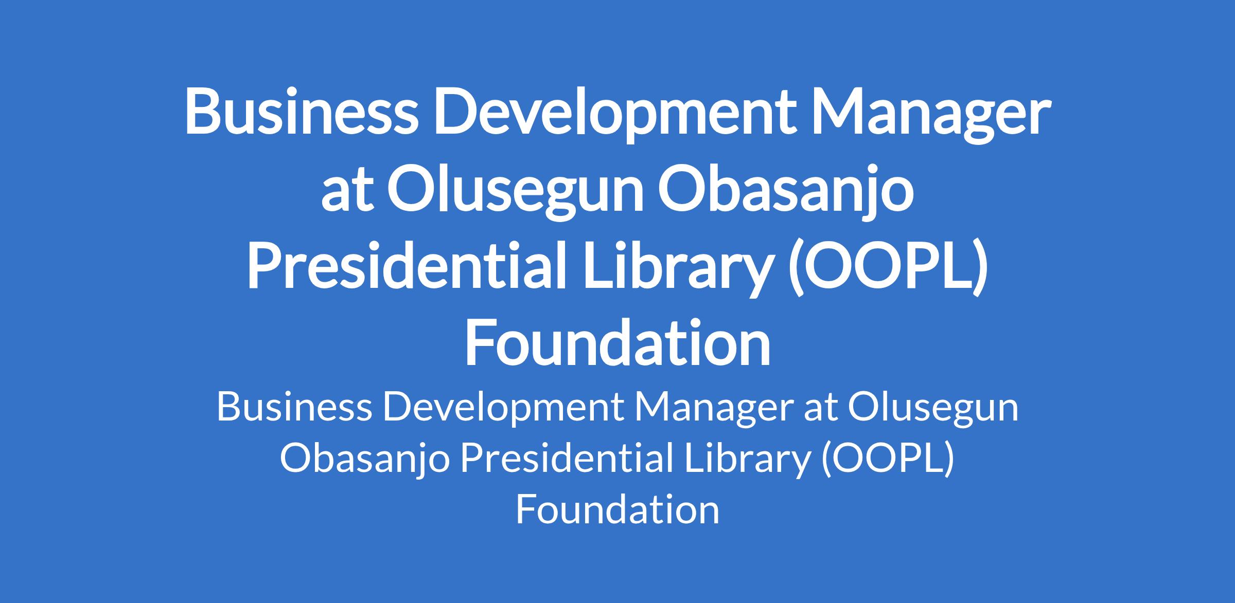 Olusegun Obasanjo Presidential Library (OOPL) Foundation is recruiting to fill the position of: Business Development Manager. The position is located in Abeokuta, Ogun State. Interested candidates should possess a Bachelor's Degree in Business, Marketing, or related fields with 5 - 10 years in business development, sales, or related role, with proven growth results.