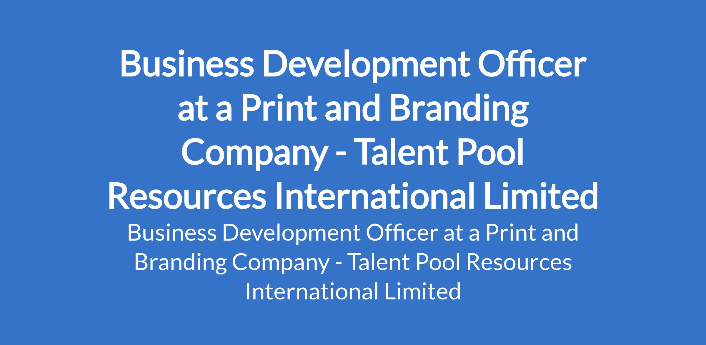 Talent Pool Resources International Limited - Our client in the Print and Branding industry is recruiting to fill the position of: Business Development Officer. The position is located in Lagos Mainland, Lagos State. Salary: N250,000 monthly. Interested candidates should possess an HND / Bachelors Degree with 3 - 5 years marketing / sales experience, and must reside within Yaba, Surulere, Ebute Metta, Costain & environs.