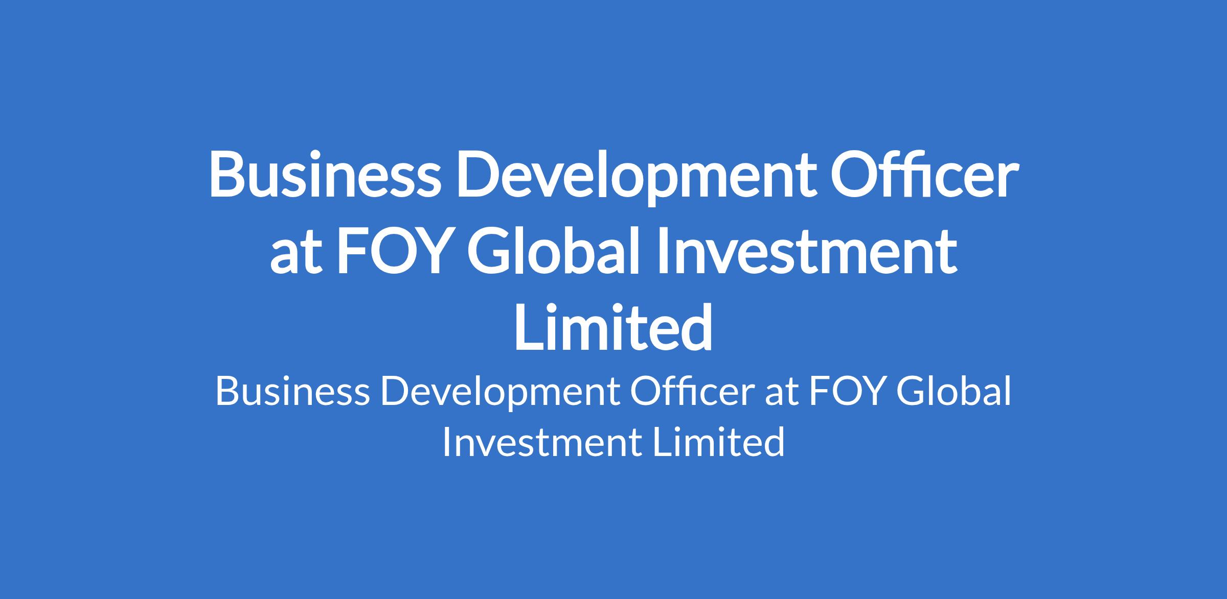 FOY Global Investment Limited is recruiting to fill the position of: Business Development Officer. The position is located in Lagos State. Interested candidates should possess a Bachelors Degree in Business Administration, Finance, Marketing, or a related field (or relevant experience) with 35 years experience in a similar role.