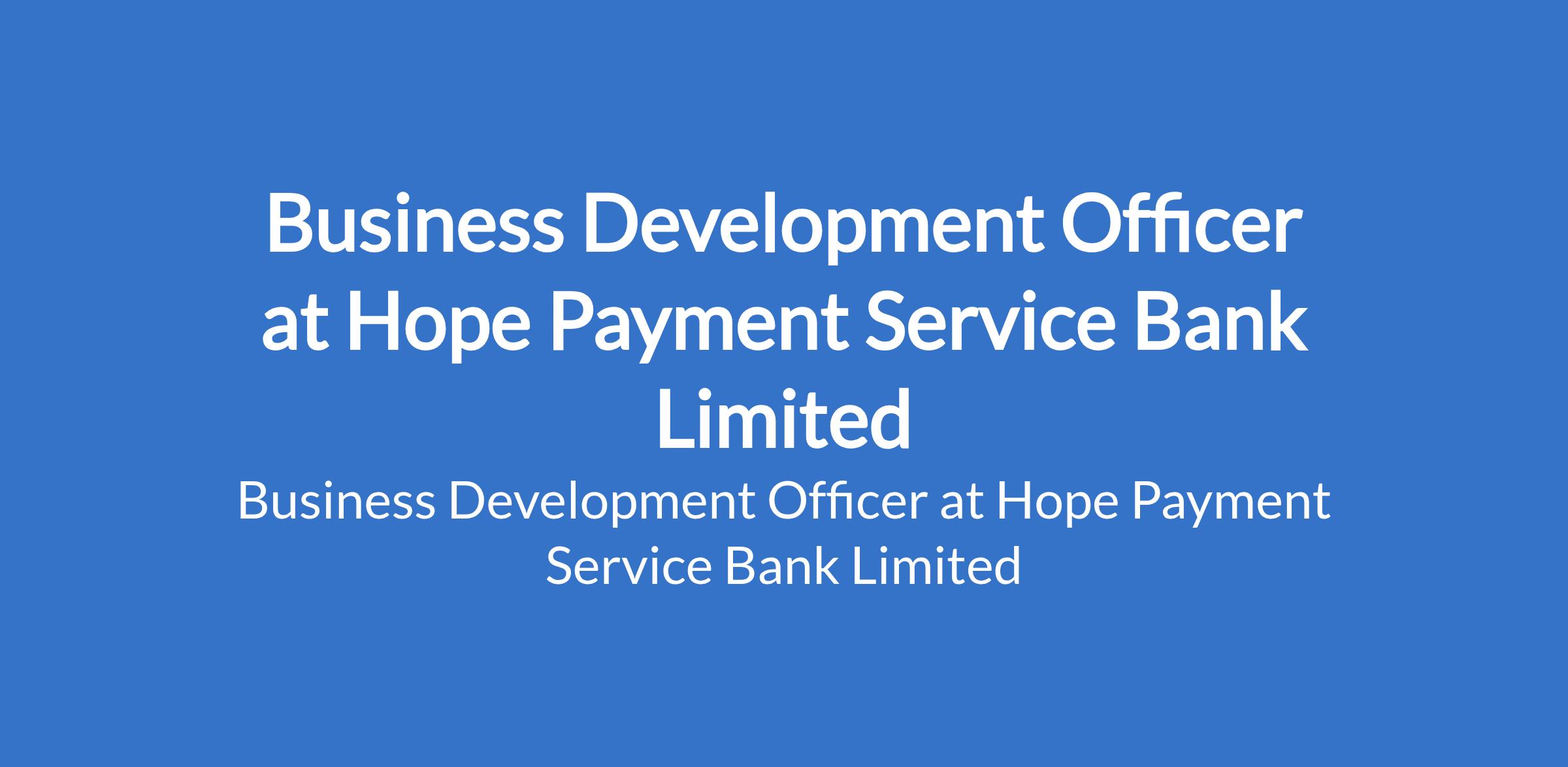 Hope Payment Service Bank Limited is recruiting to fill the position of: Business Development Officer. The position is located in Lagos State. Interested candidates should possess a minimum of a University Degree in Accountancy, Marketing, Business Administration, or any other relevant discipline from a reputable institution with 7 to 10 years post-graduation experience in Banks, Agency, or Micro Finance and Mobile Money sectors; An MBA or masters degree in any business-related discipline is an added advantage.