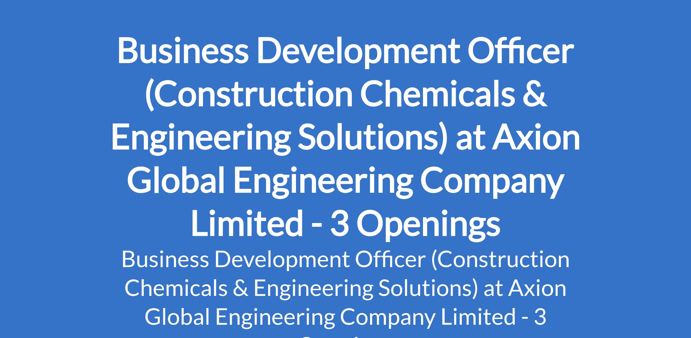 Axion Global Engineering Company Limited is recruiting to fill the position of: Business Development Officer (Construction Chemicals & Engineering Solutions). The position is located in Abuja (FCT), Lagos, and Port Harcourt - Rivers States. Interested candidates should possess a Bachelors Degree in Engineering, Business Administration, Marketing, or related field with 2-4 years of proven experience in construction chemicals, paints / coatings, or building materials industry (mandatory).
